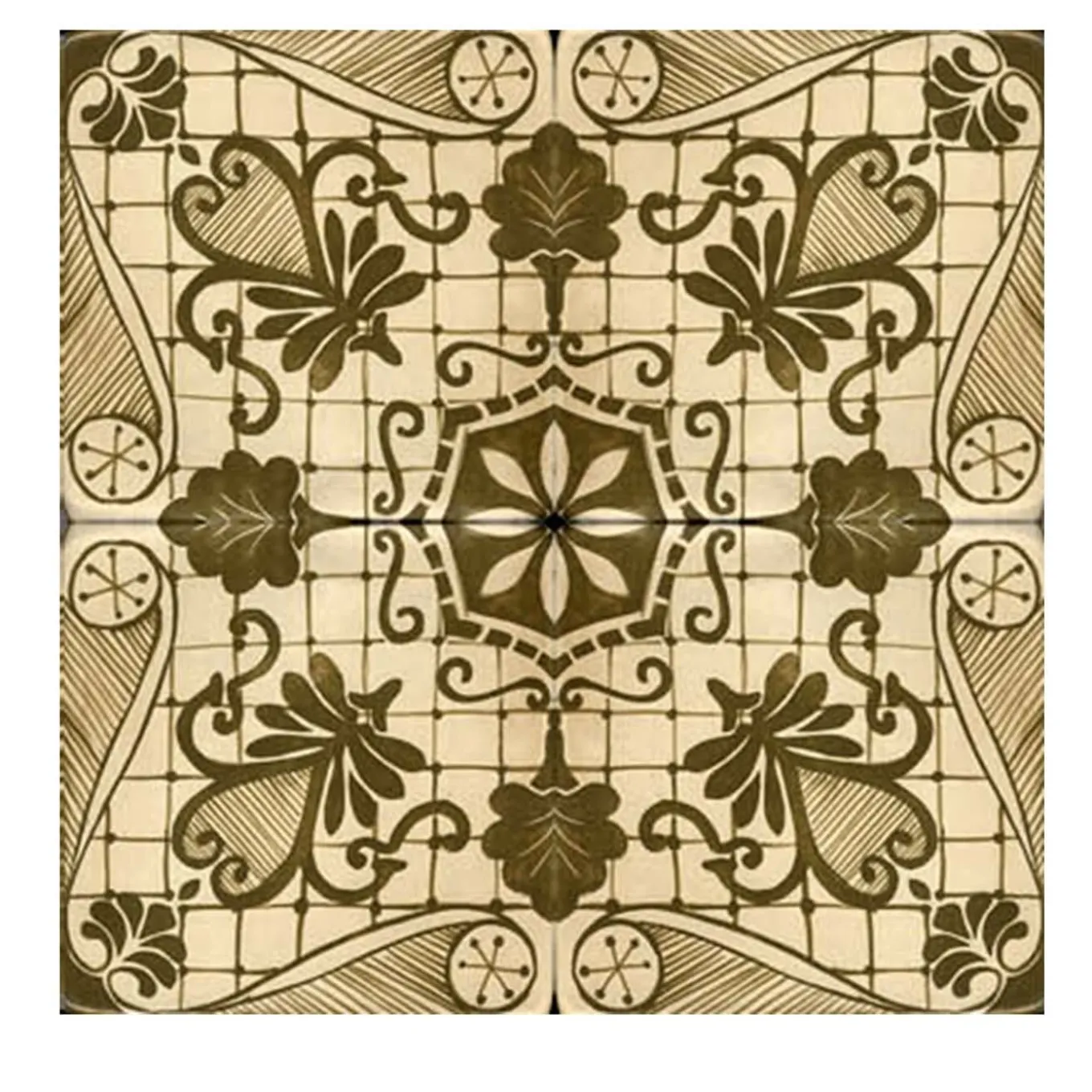 Fashioned entirely by hand, these striking tiles will be a timeless statement piece in a garden, patio, or kitchen decor. Crafted, painted, and glazed by hand, these tiles feature an intricate design revealed in four tiles, boasting frond-like motifs and scrolls in brown radiating from a central flower, framed by an undulating, bell-shaped outline. The underlying grid adds a touch of linearity that highlights the exceptional artistry of the piece. These tiles must be applied with minimal grouting in a bathroom or kitchen to ensure the intended mirror effect.