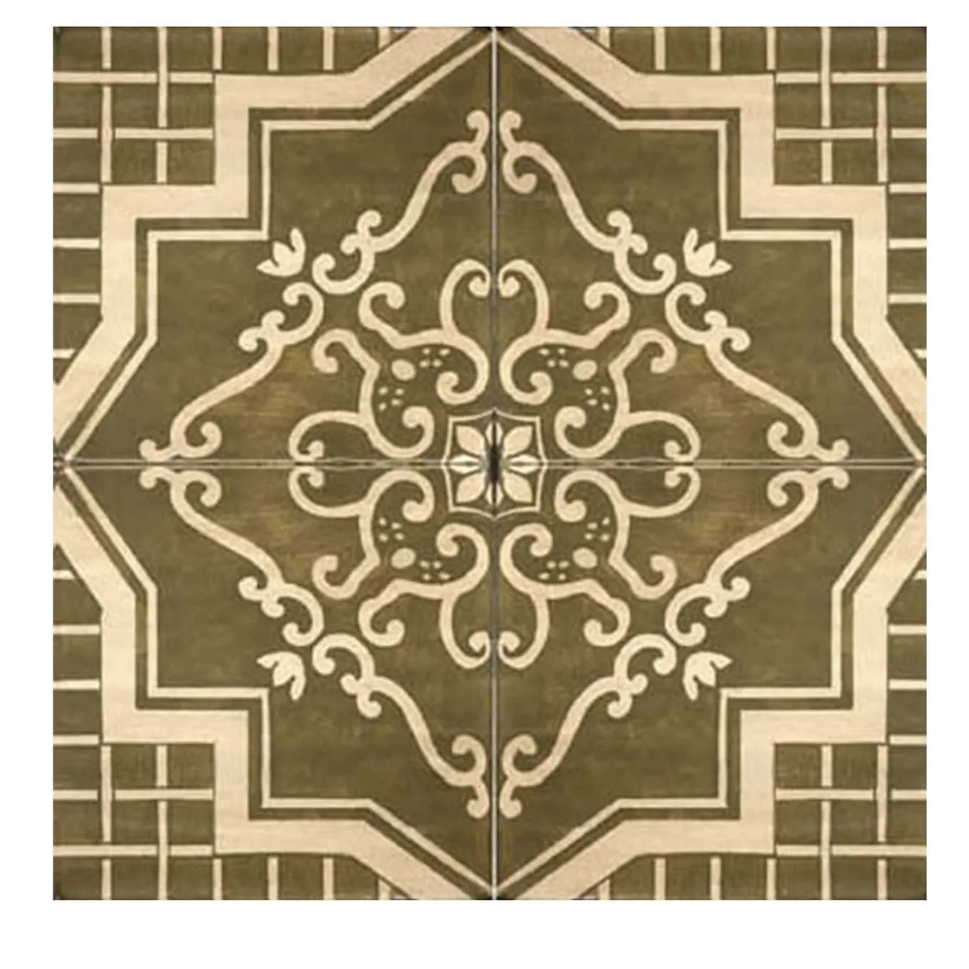 Striking and versatile, this captivating set of tiles are merges clear lines with traditional Sicilian craftsmanship. Entirely hand-painted and glazed, these four tiles reveal an intricate design that features frond-like motifs set on a brown background with a sinuous geometric, double border frame. The underlaid grid adds a touch of linearity that enhances symmetry of the piece. These tiles will add an elegant touch in a monochromatic or post-modern bathroom or kitchen interior. Best mounted with minimal grouting for a seamless finish.