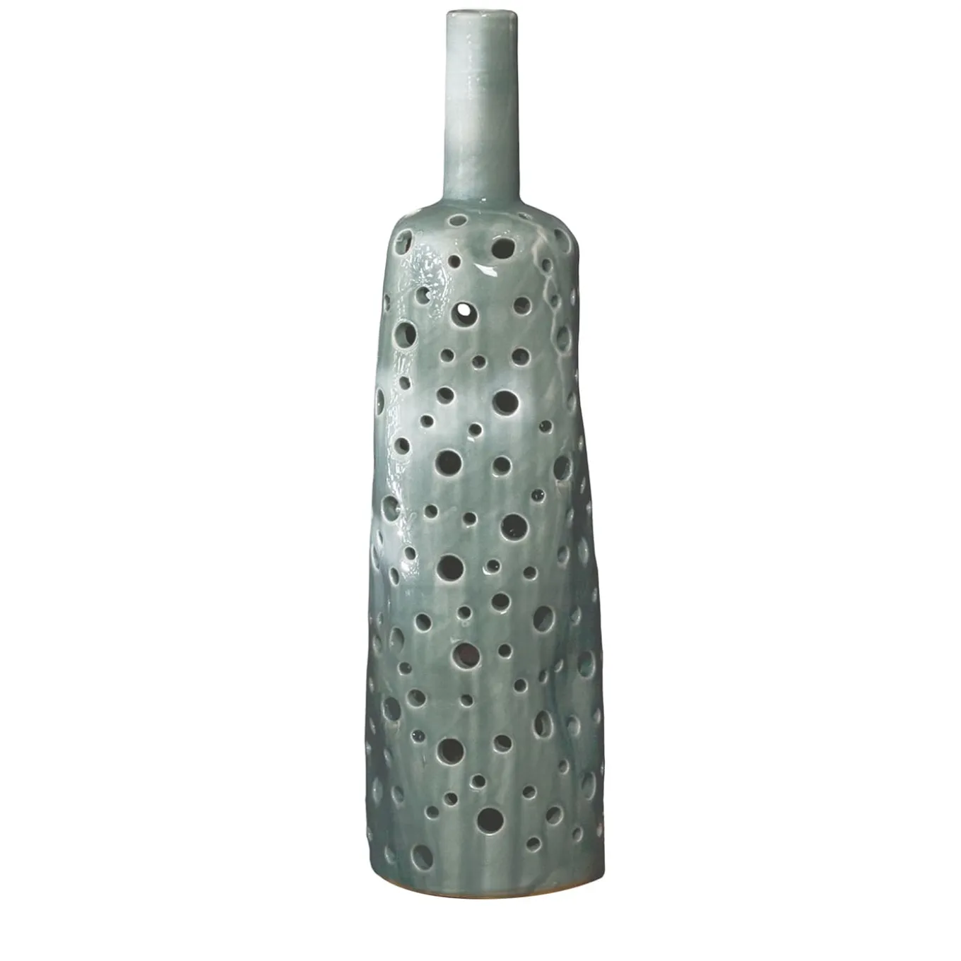 Inspired by rocks shaped by waves and wind over centuries, this ceramic vase from the Macchia Mediterranea Collection stands out for its openwork design. A delicate green finish enriches its silhouette and narrow neck. This splendid piece can serve as an artful lantern or decorative piece for seasonal floral arrangements.
