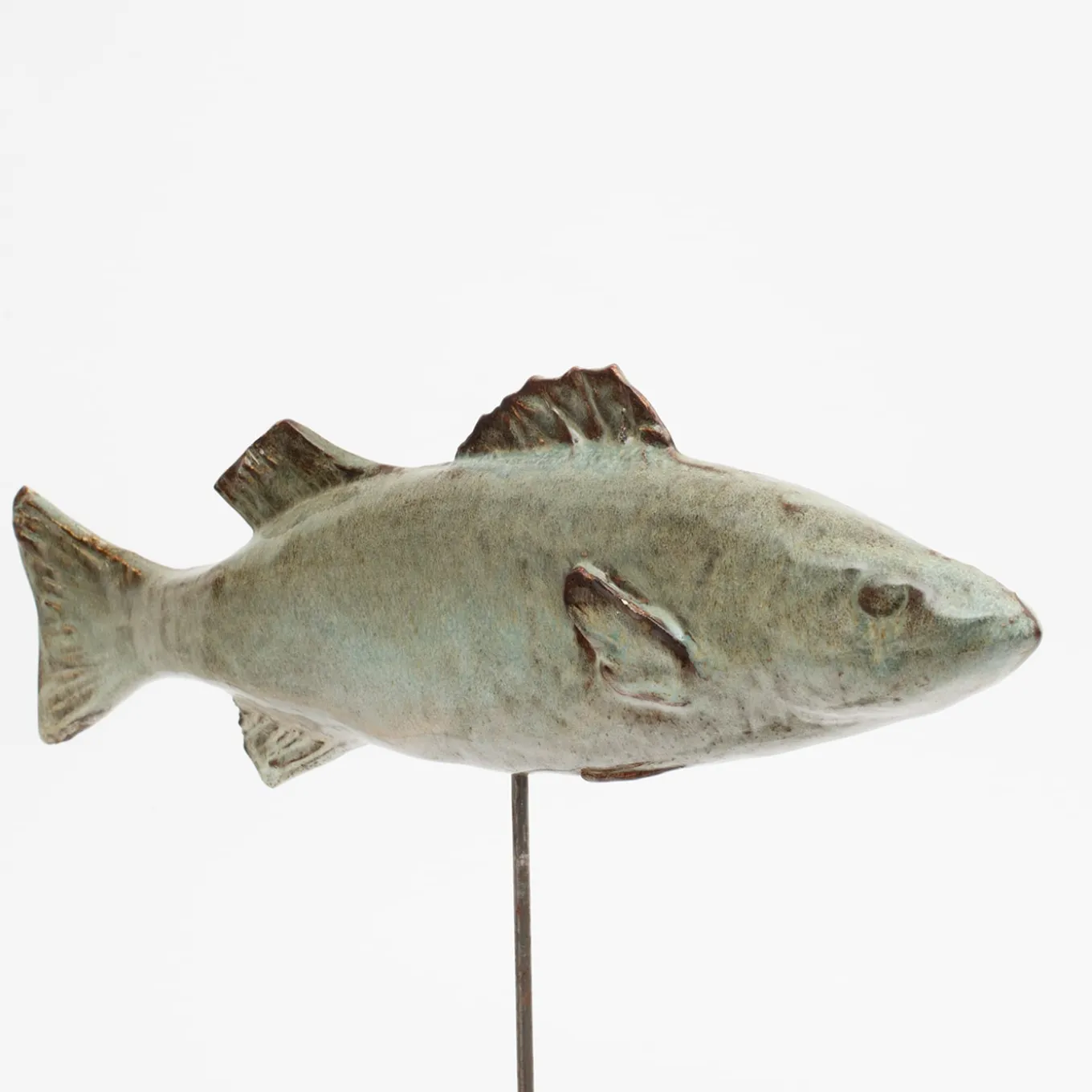 This seabass is part of the table Aquario group but is also doing very well on its own; the ceramic fish stands on an iron base whose height can be adjusted as desired. An iconic and symbolic auspicious animal, it is modeled and glazed to recreate marine chromatic effects of unique elegance. Each piece is different from the other and can be alone or part of a private seascape. Please, contact the Concierge for further information.
