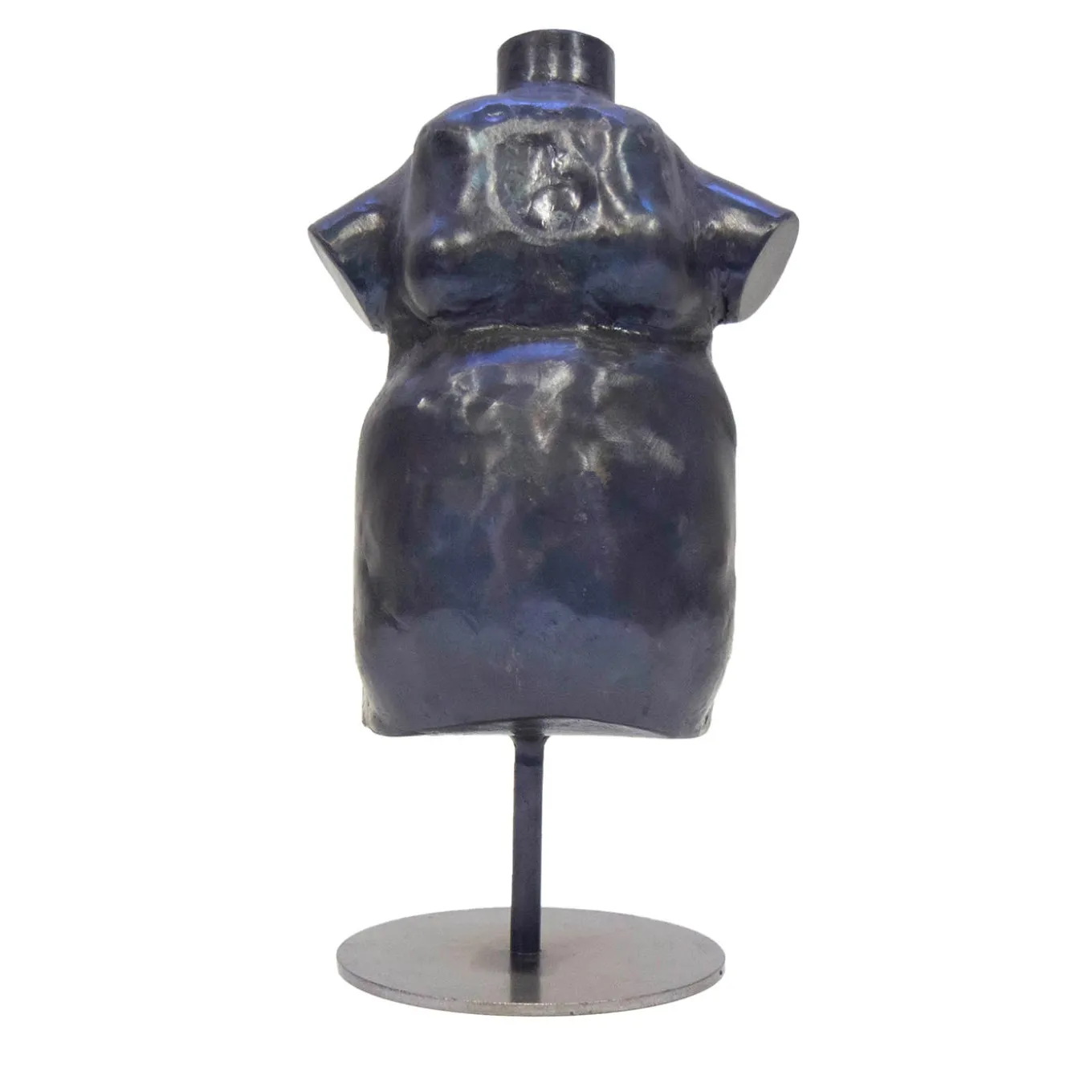 Deftly handcrafted of iron, this small, entirely unique sculpture celebrates the natural curves of a woman in deliberate contrast with the thin, streamlined stem connecting the body to the sober round base. Her stylized bust was crafted following a particular technique in which the metal sheet is shaped by hand directly onto the anvil when it is still hot.