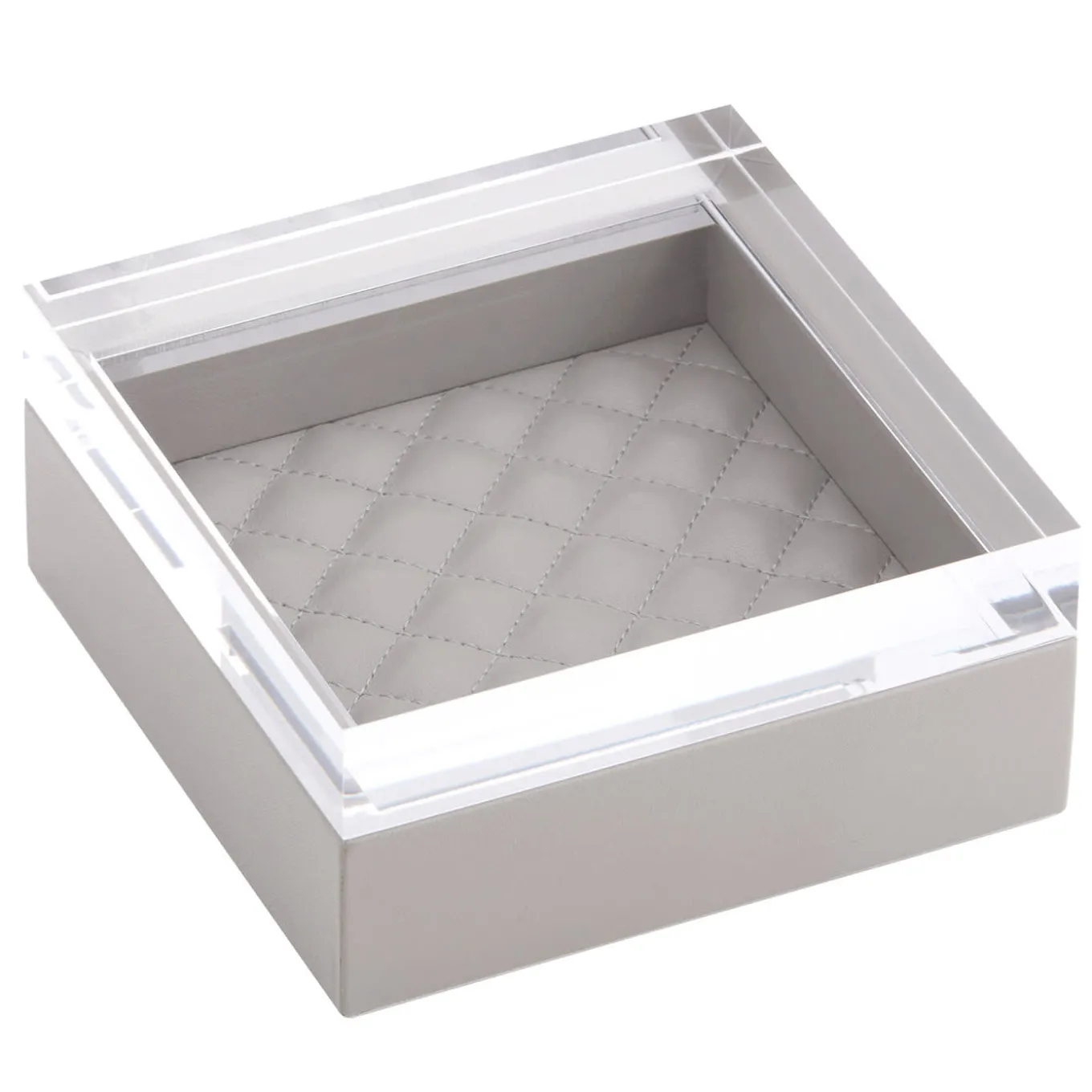 Febe leather box is available in different sizes and boasts an acrylic lid. Internally it has quilted diamond padded lining. It is perfect for all kinds of decorations and environments, from classic to modern spaces.