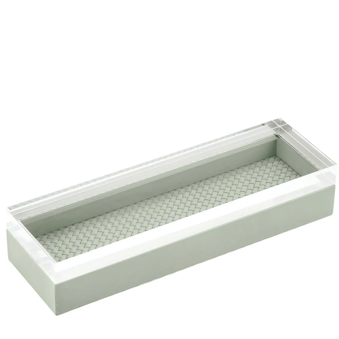 Leather box with acrylic lid, padded handwoven lining. The simple and practical shape allows these boxes to be the perfect storage for trinkets and other goods while adding a precious touch to any interior.