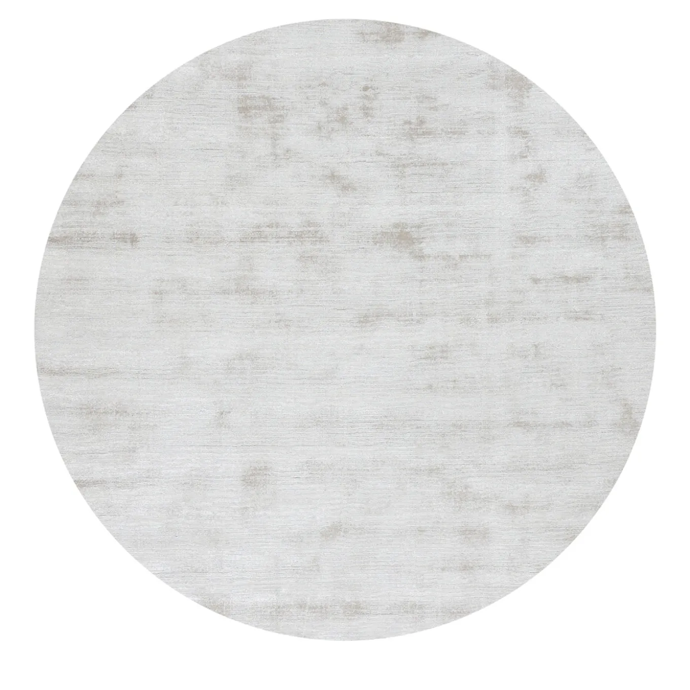 Crafted using the cut-loop technique, the feel round gray Pearl round banana silk rug showcases an iridescent luminosity and a finely textured silkiness. Handwoven in India, this piece offers a subtle palette with gentle tonal variations that enhance its tactile appeal. Its round shape and medium size make it a versatile addition to various interior settings, providing understated elegance with a refined, luminous quality.