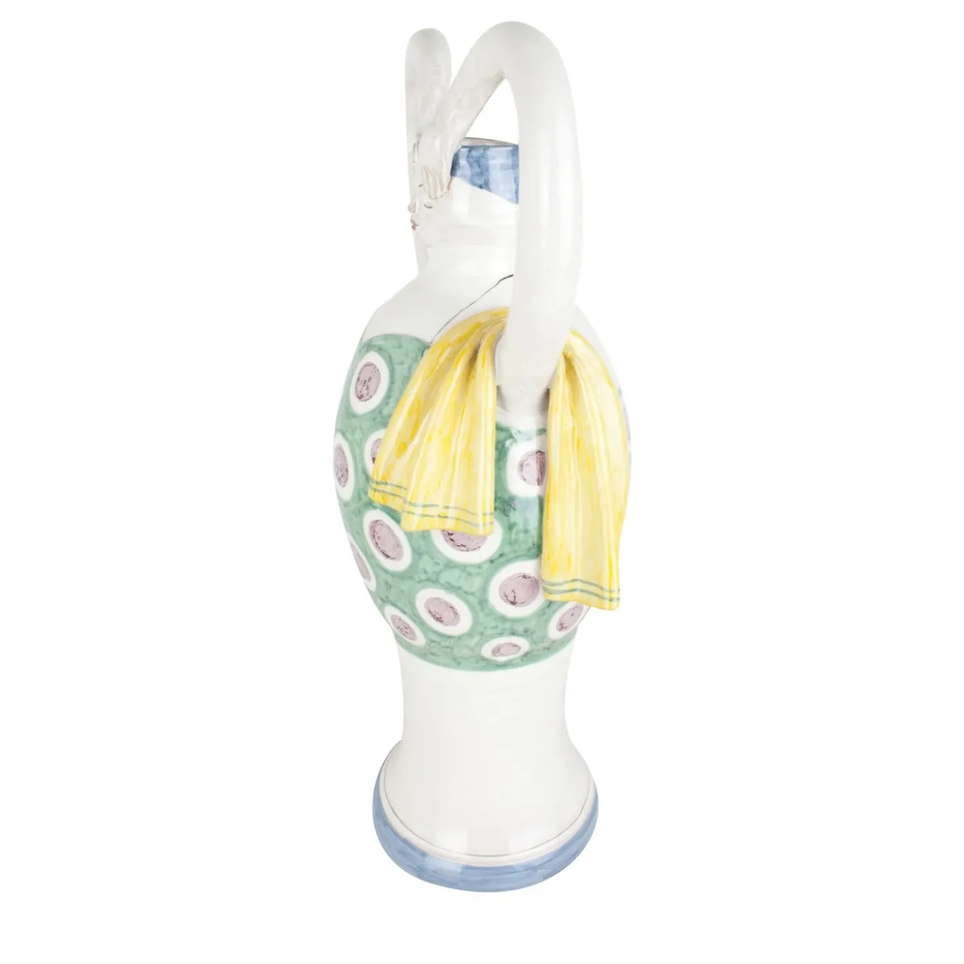 This delightful work of art doubles as a vase which can be used to store any liquid desired. The charming shape of the vase is made to recreate the look of a swimmer ready to take a plunge, her arms stretched above her head serving as the two handles of the piece. The colorful painting on the suit of the swimmer is achieved by hand-applied vibrant glazes. The swimmer also has her towel over her shoulder, a detail added by hand after the shape was crafted on a lathe.