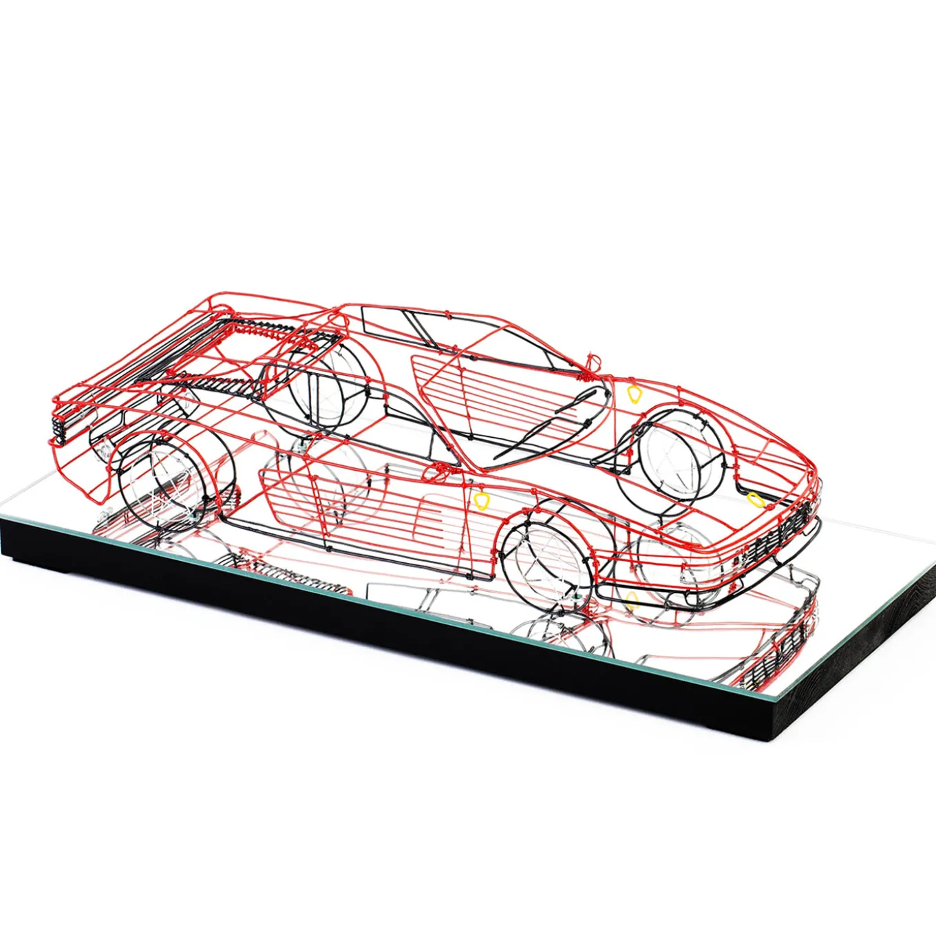 A striking tribute to Italian automotive design, this handmade wire sculpture showcases the iconic Ferrari in a vibrant red hue, accentuated by silver and black iron details. Its sleek contours rest atop a glossy black base with a mirrored finish, creating a dynamic display piece. Fully customizable in both model and color, this sculpture is the ultimate collectible for car enthusiasts. Please contact the Concierge for bespoke options and further details.