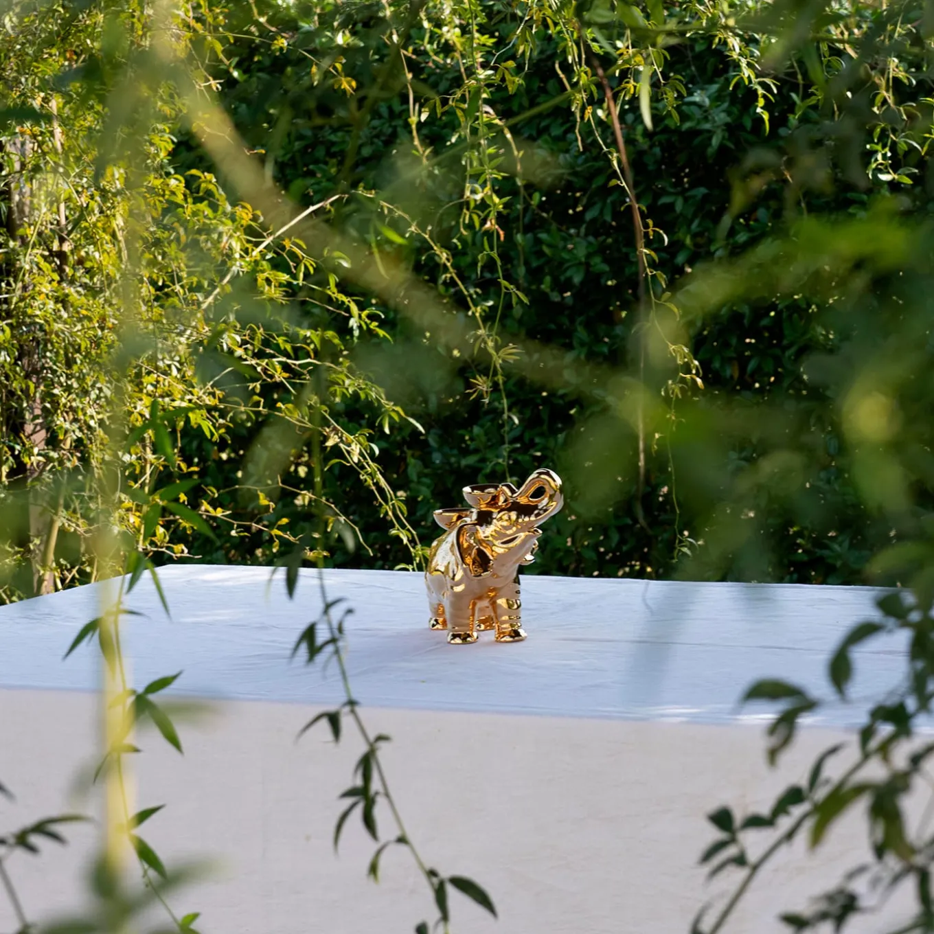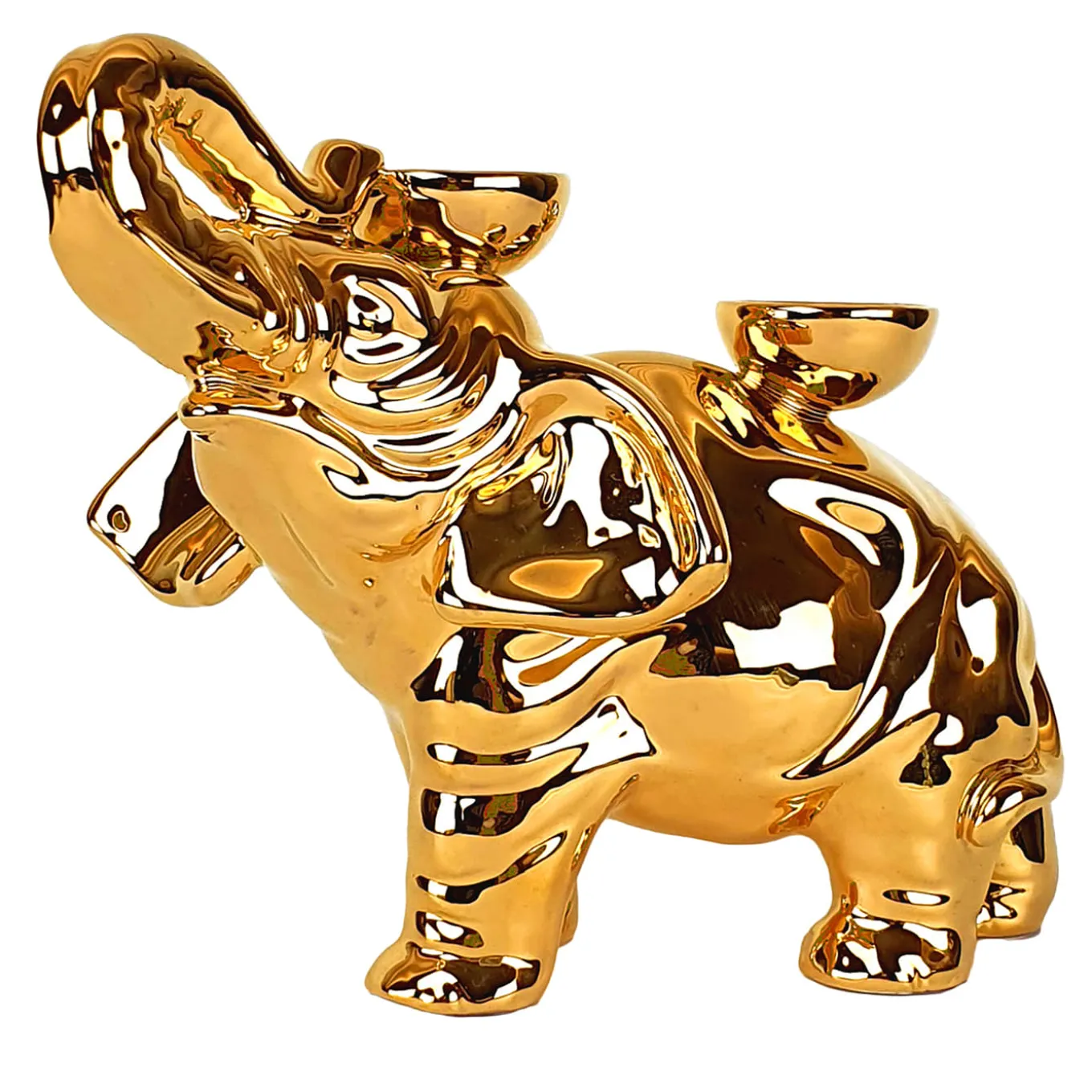 Luxury and whimsicality effortlessly coexist in this elephant-shaped majolica candleholder, its silhouette obtained from fired clay originally poured into a mold. Deftly painted by hand in a vivid golden tone, the surface gains a perfectly smooth and glossy finish thanks to the double-firing process. A couple of built-in bobeches complete the piece, which comes in multiple animal variants and color options.