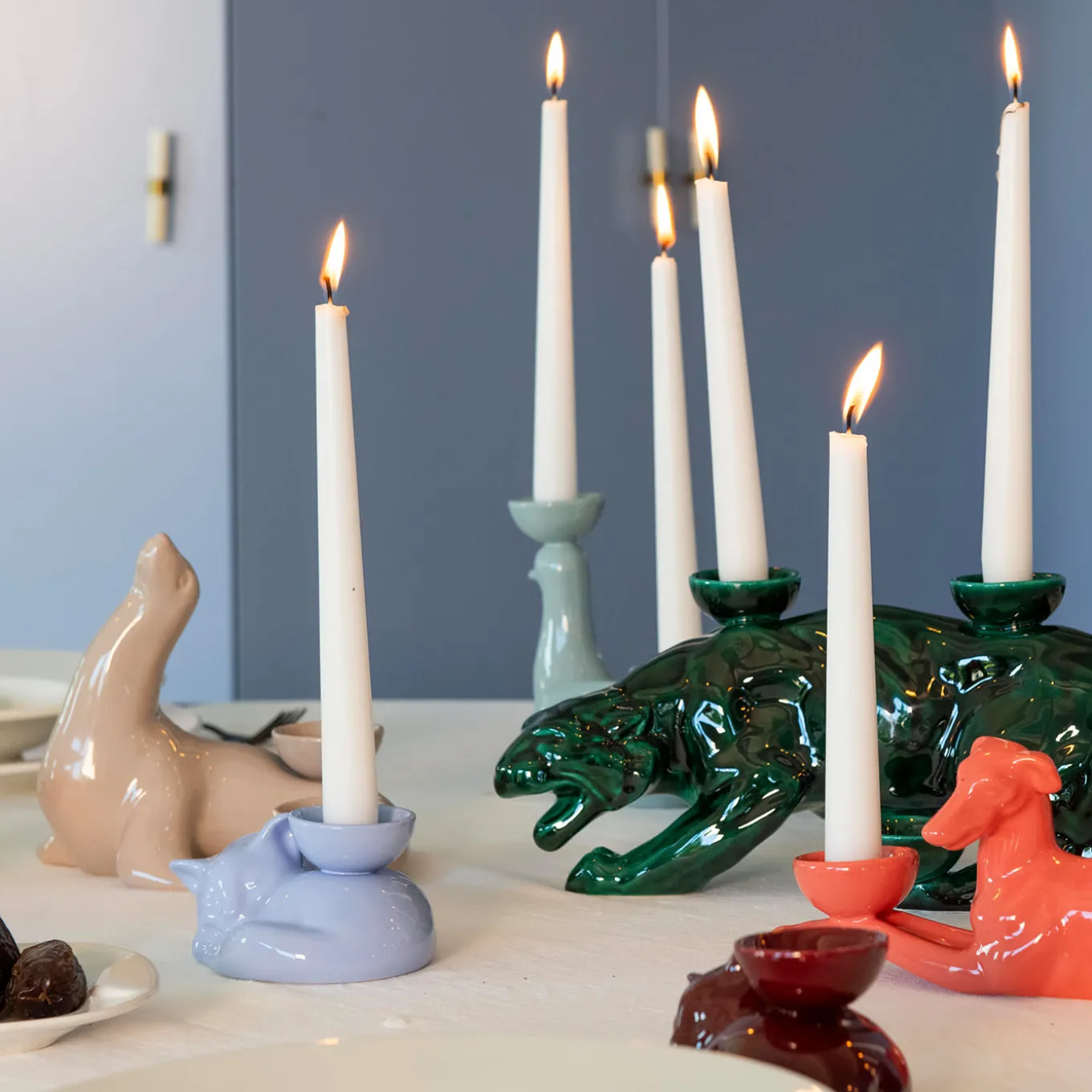 A sense of dare and luxury is exuded by this panther-shaped ceramic candleholder. Obtained from pouring liquid clay into a mold that, once dried and fired, is deftly handpainted in emerald green, the candleholder undergoes a second firing step that achieves the striking vitrified and high-gloss finish. Incorporating three bobeches, the piece also comes in different finishing options.