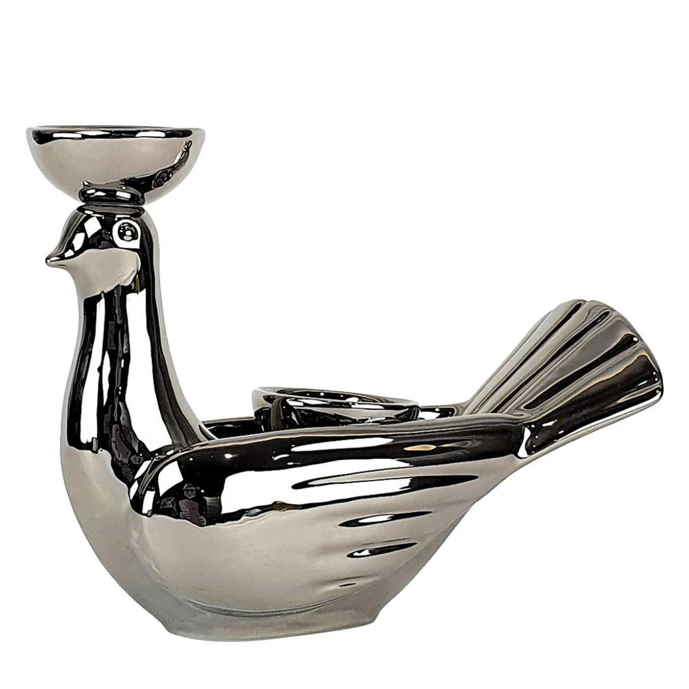 Shaped like a tender dove, this majolica candleholder from the Fiamme Bestiali Collection is perfect for enriching tables with a glamorous and romantic accent. A strikingly glossy finish maximizes the glare of its handpainted platinum body, which was originally obtained using a mold and consequently fired twice. Different finishes and animal shapes are available in the Artemest catalog.