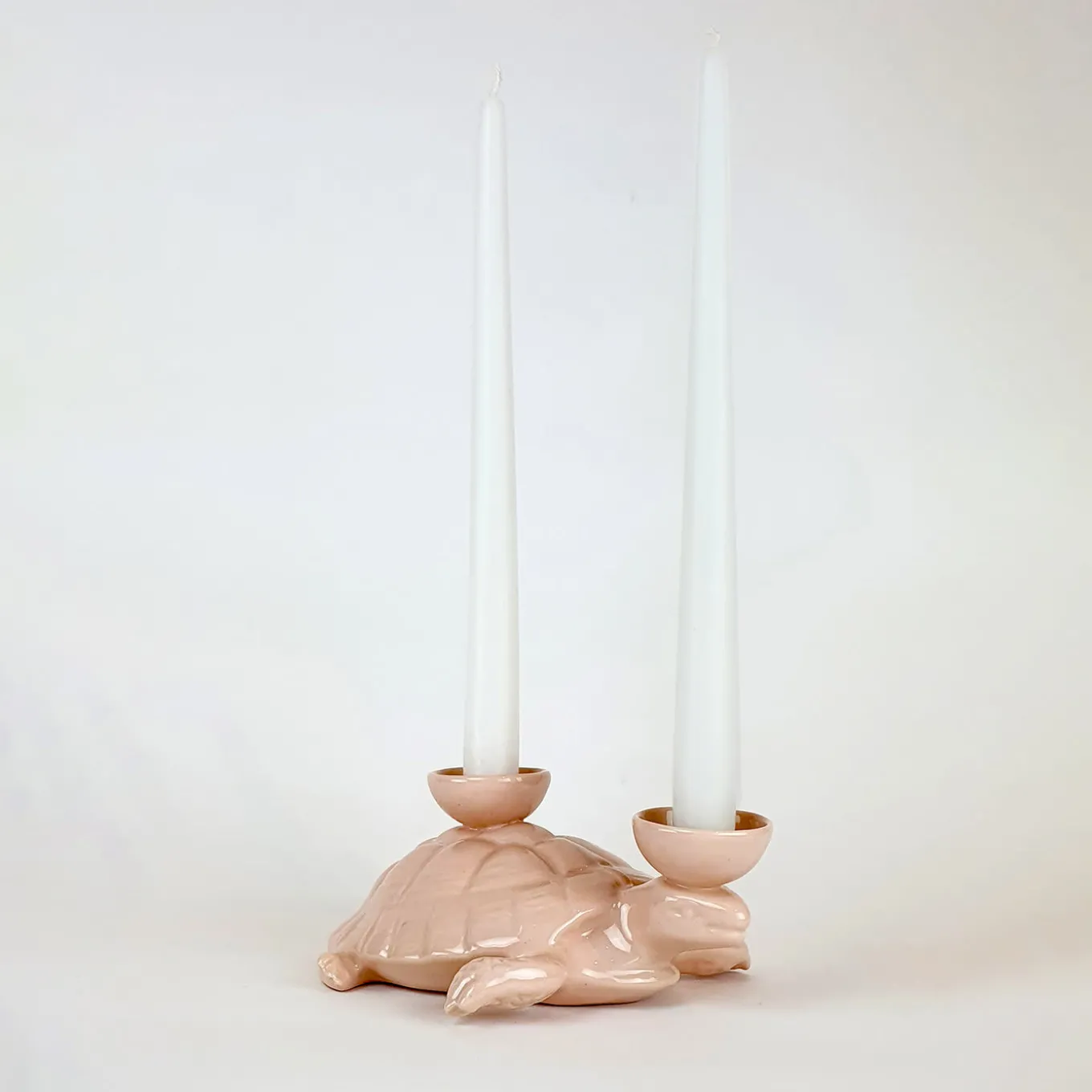 Obtained from pouring liquid clay into a mold, this playful turtle-shaped candleholder incorporating a couple of bobeches flaunts an elegant majolica surface. Handpainted in pastel pink for a romantic and delicate statement, the zoomorphic body undergoes two firings to reveal its glossy and smooth design. Multiple color variants or versions featuring different animal shapes are also available in the Artemest catalog.