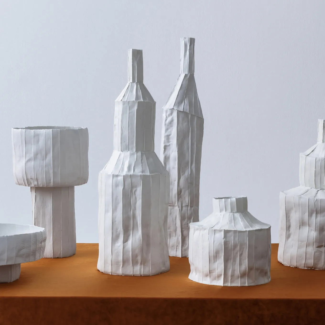 Part of the Fide series of sculptures, inspired by the majestic architecture of the cathedrals, this bottle-shaped piece is handcrafted in Paronetto’s signature paper clay, a clay base with paper pulp and natural fibers. The silhouette rises from three tiers of round shapes in decreasing size, with a textured surface of vertical segments. The bright white color adds an ethereal flair to this unique still-life object that can be displayed with other pieces from the same designer for a refined look.. Every one of Paola Paronetto’s creations is unique. Slight variations in shape, colour and size are to be considered a guarantee of authenticity and value. They are finished with non-toxic satin-finish enamels. Although very rarely, it is possible for them to leak after long periods of exposure to water. It is therefore advisable to test their water resistance before using them on delicate surfaces. They should not be used as dining utensils. The white pieces can be washed with water or sanitizing products, whereas the coloured pieces must be treated more gently and cleaned with a feather duster or a soft cloth, dry or moistened very slightly with water.