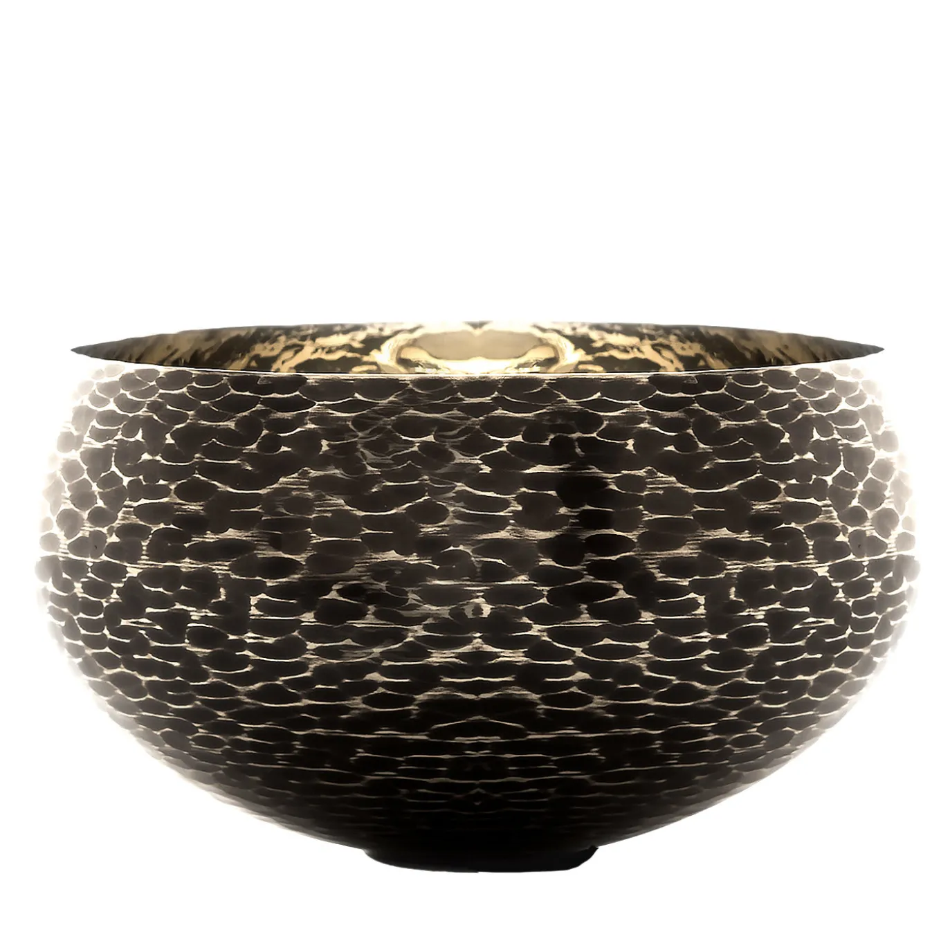 This large bowl was made of bronze that was given a special burnishing, creating unique decorative patterns on its exterior. A very versatile piece of functional decor, this bowl can double as centerpiece on a dining table and can be used in an entryway to store and display small everyday trinkets. This striking object can be paired with the Filicudi Bowl for a dynamic effect.