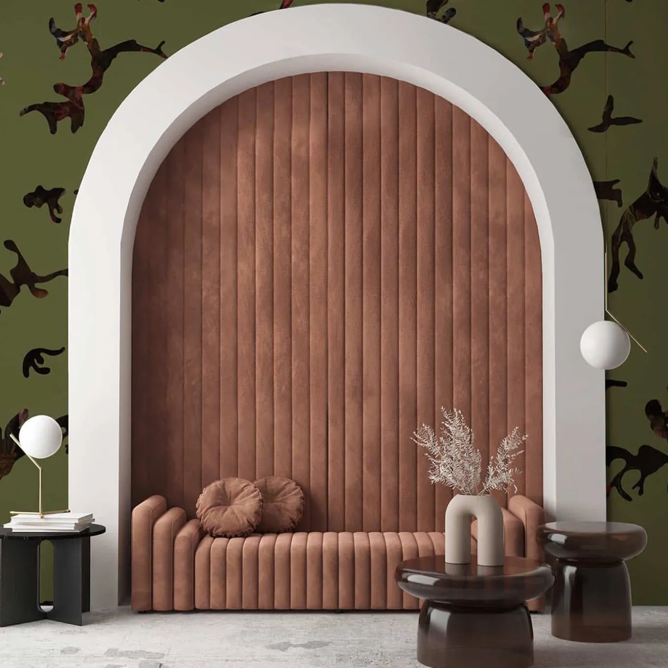 Inspired by the fusion of camouflage and engravings, “Find Me In The Dark” wallpaper from Magnus Gjoen seamlessly blends bold patterns with intricate details. Part of the Racconti Collection at Spazio Miscellanea by MaVoix VOL I, it features a military green base, priced per square meter. Printed on eco-friendly FINE ART wallpaper with a matte finish, also available on CANVAS texture.