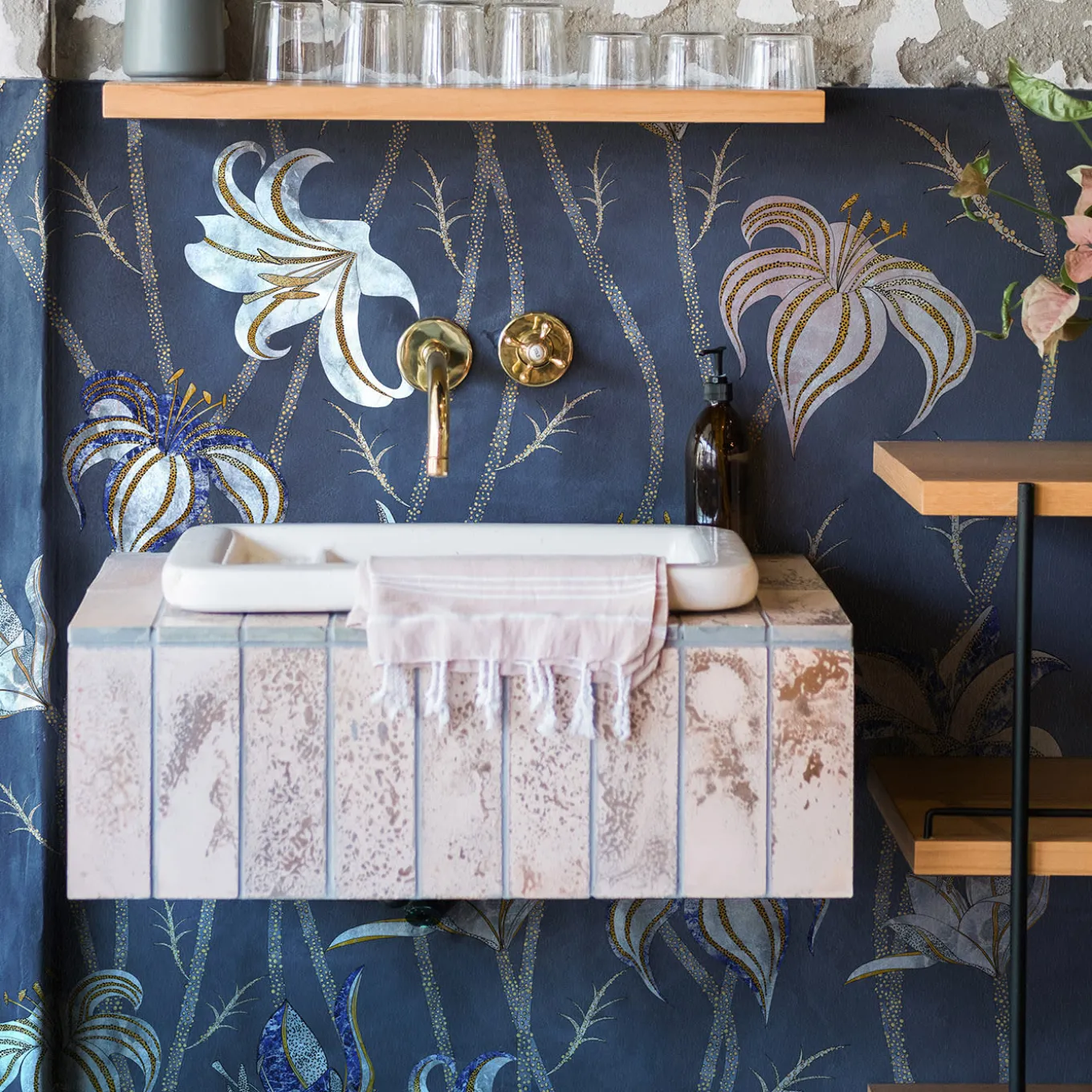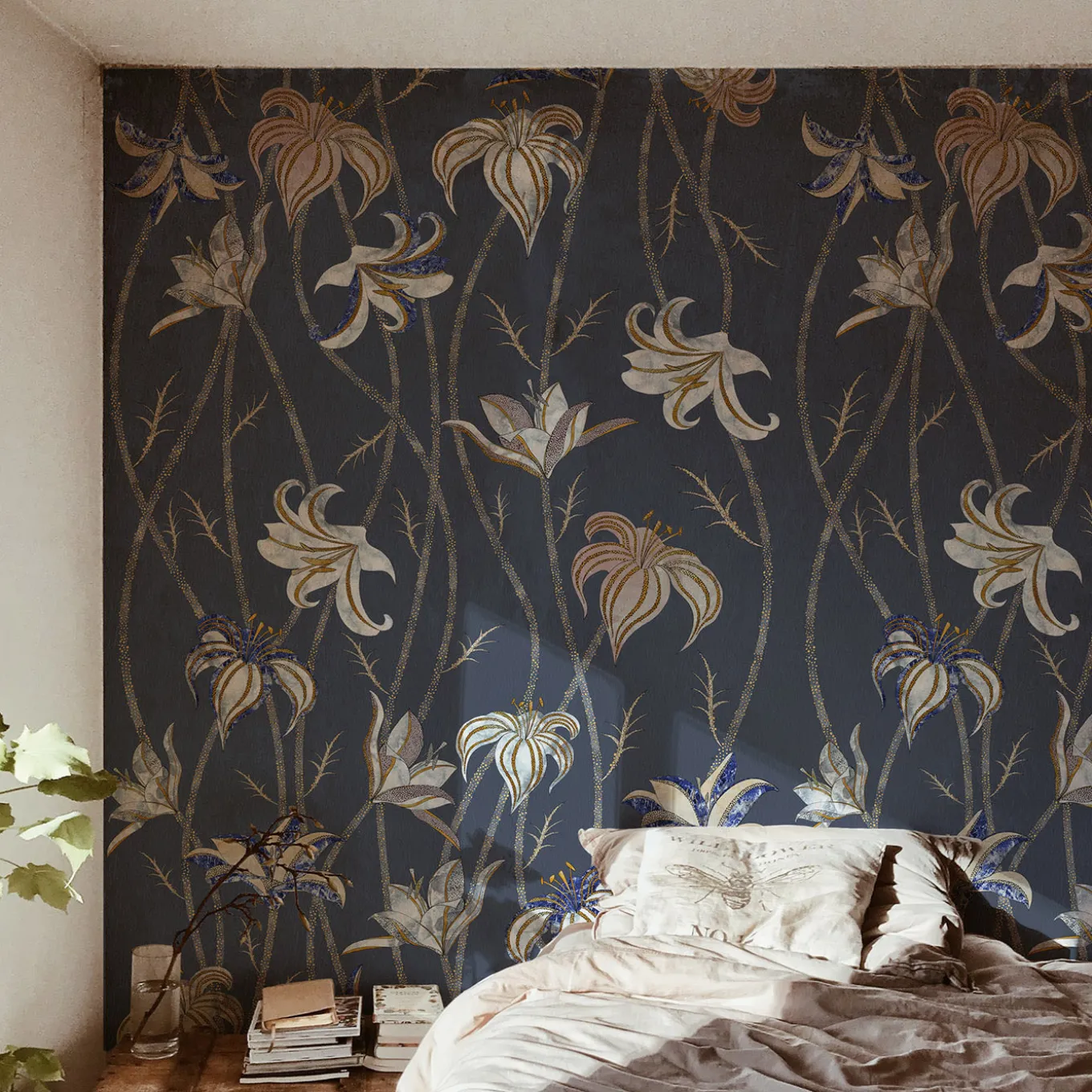 Fine and very long stems run along the whole wall, to end as super-light flowers of Lilium Lancifolium, best known as Tiger Lily. After a careful look at these flowers’ designs, it is possible to catch sight of colors and textures that are part of another reality: the ancient technique named Scagliola, the Art of Moonrock. The wallpaper Fiori is freely inspired by this very ancient art, which consisted of the skillful workmanship of plaster. This was then used to replace more precious materials.