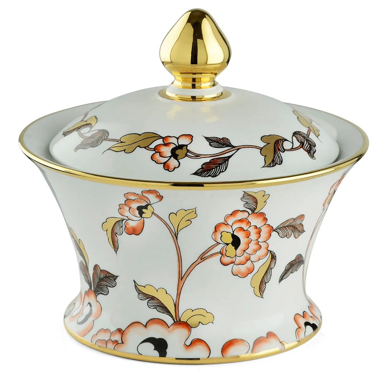 An exercise in mixed styles, this gorgeous box with a lid follows the timeless procedures of refined Italian craftsmanship while exuding a romantic East Asian charm. Deftly handmade of fine white porcelain enhanced with pure gold painted details, it is entirely decorated with a fascinating bunch of Chinese flowers lending it a delicate and graceful quality.