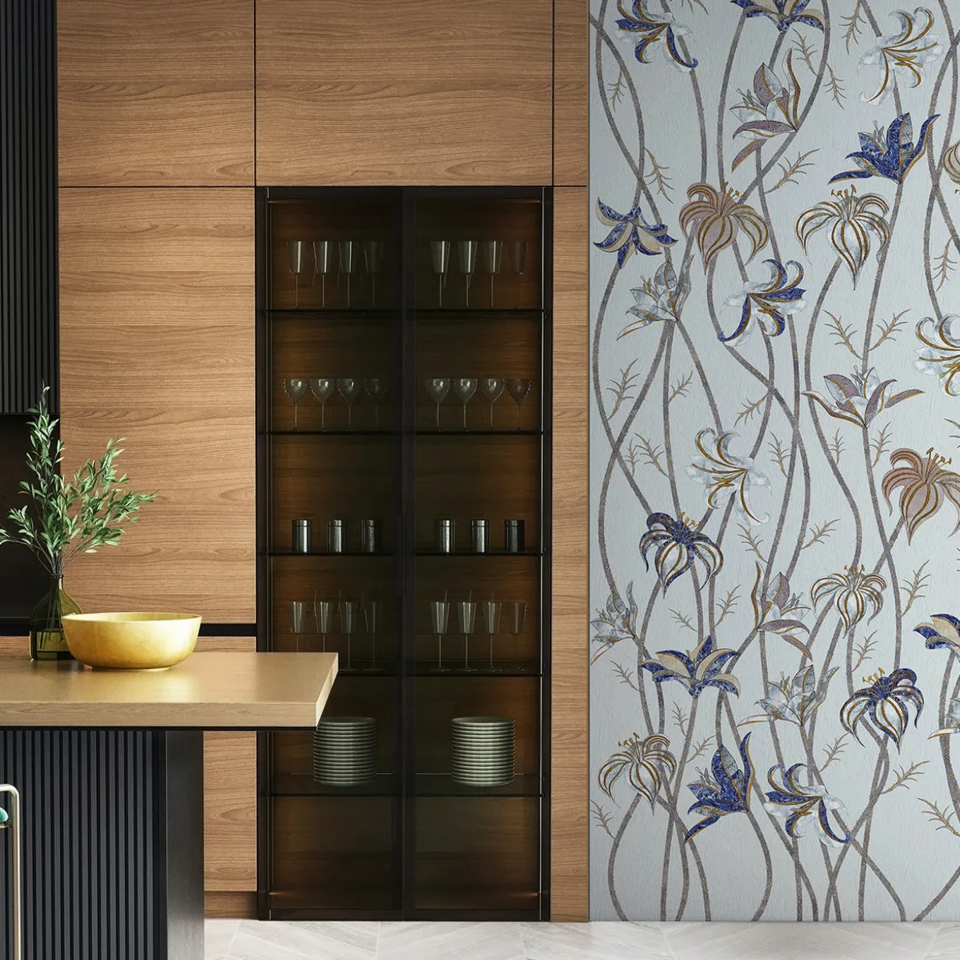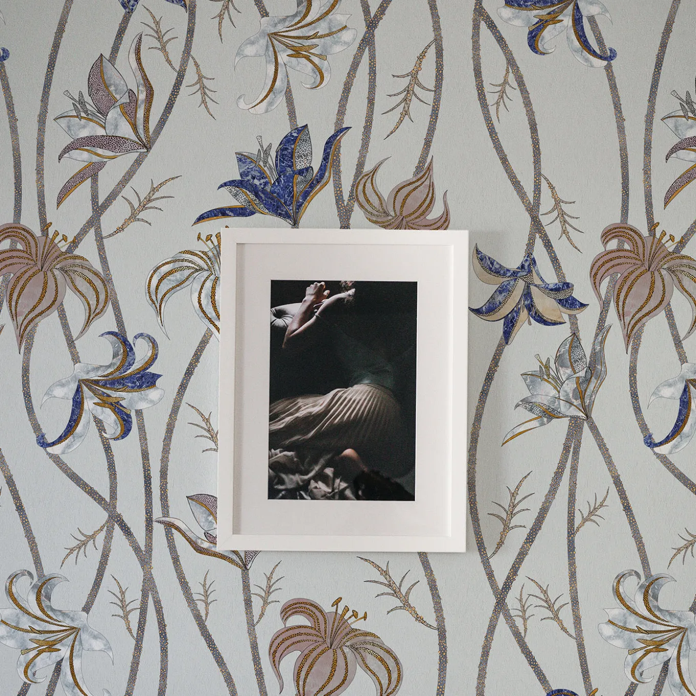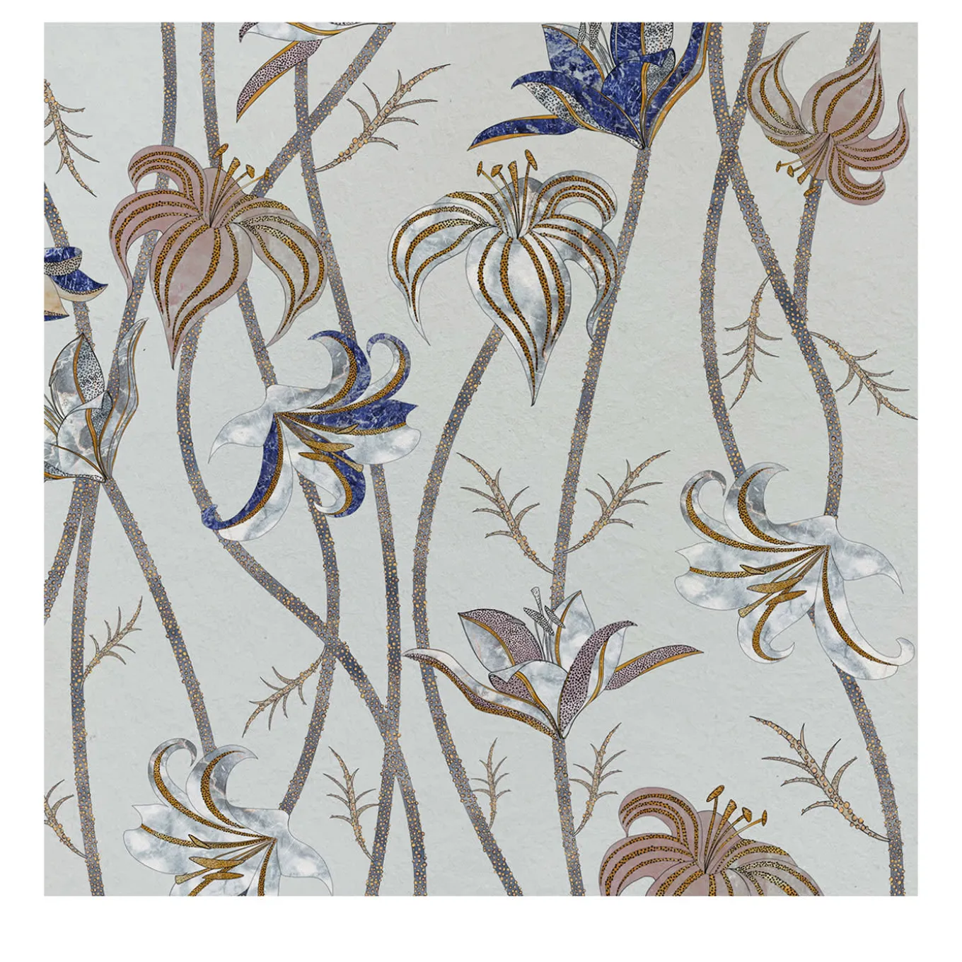Fine and very long stems run along the whole wall, to end as super-light flowers of Lilium Lancifolium, best known as Tiger Lily. After a careful look at these flowers’ designs, it is possible to catch sight of colors and textures that are part of another reality: the ancient technique named Scagliola, the Art of Moonrock. The wallpaper Fiori is freely inspired by this very ancient art, which consisted of the skillful workmanship of plaster. This was then used to replace more precious materials.