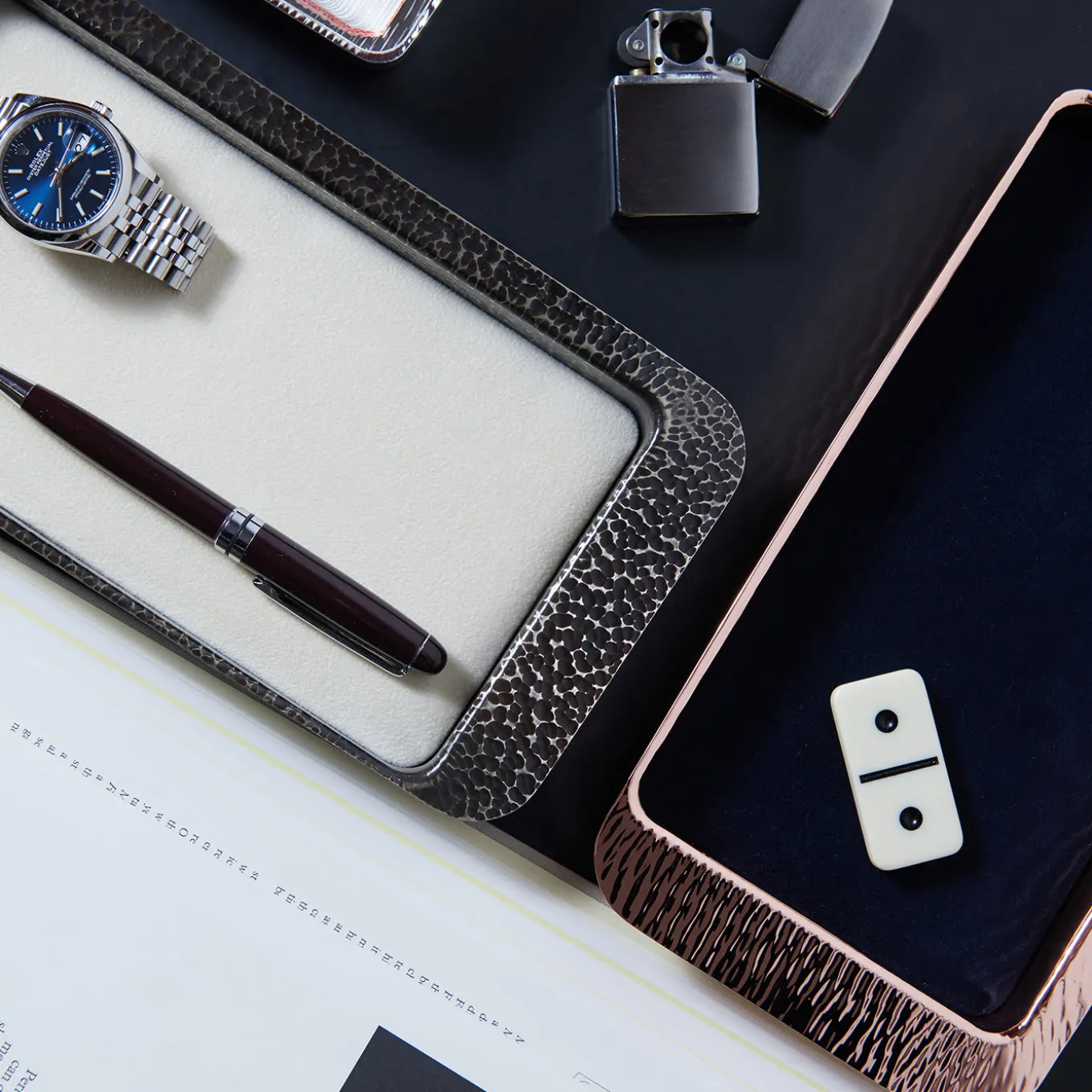 An exquisite empty pocket tray to adorn a contemporary interior, this exceptional design combines a stunningly refined aesthetic with a functional character. Handcrafted of copper hammered in a water-like pattern, it is embellished with an internal removable pad in navy blue fabric, also available in pink, cream white, or light blue upon request. Its shiny and detailed rectangular shape is also offered in a version made of burnished bronze, silver alloy, and gold-finished brass.