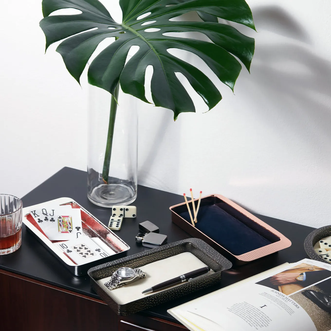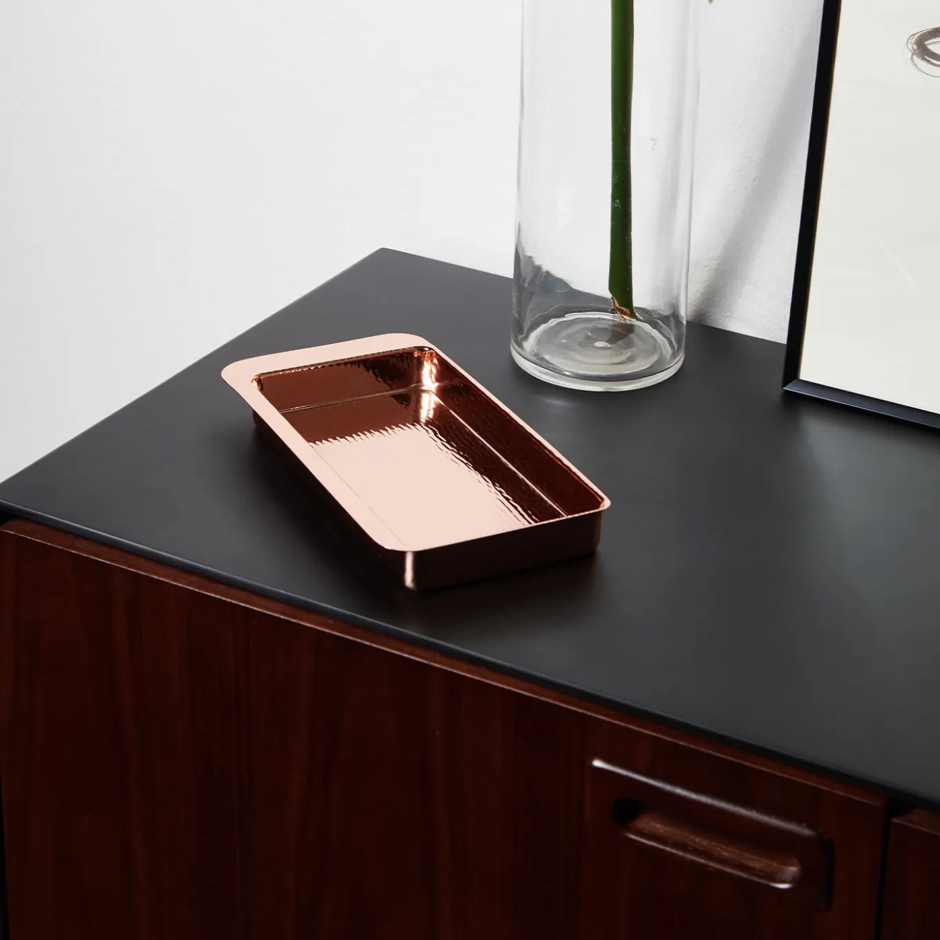 A bold design, this empty pocket tray is entirely handcrafted of copper, showcasing a natural luminous flair and a hand-hammered textural motif inspired by the sinuosity of water. Rectangular yet smoothly rounded, it will stunningly decorate a contemporary interior. Also available with an internal removable pad in cream-white, pink, blue, or light blue, or variants made of gold-finished brass, burnished bronze, or silver alloy upon request to the Concierge.