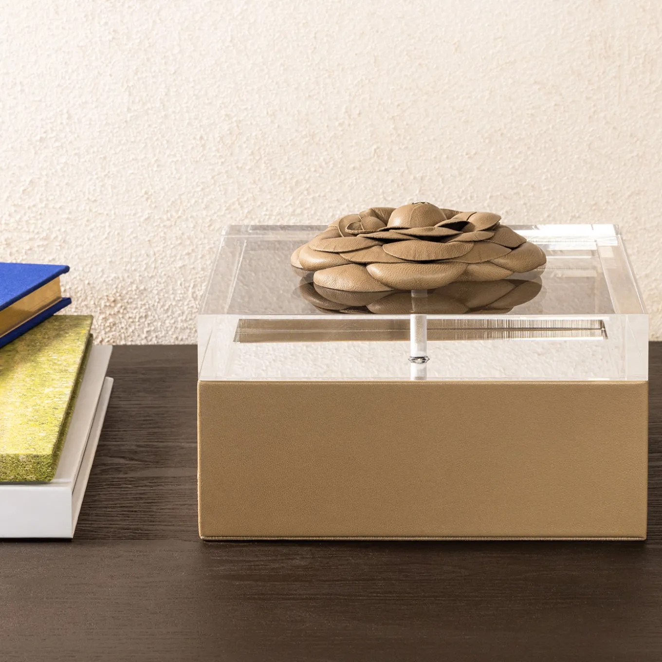 Fleur square box is covered with the finest leather, which makes its appearance timeless, perfect for all kinds of decorations and environments, from classic to modern spaces. It is available in different sizes and boasts an acrylic lid with a leather flower on the top. Internally it has a quilted diamond padded lining.