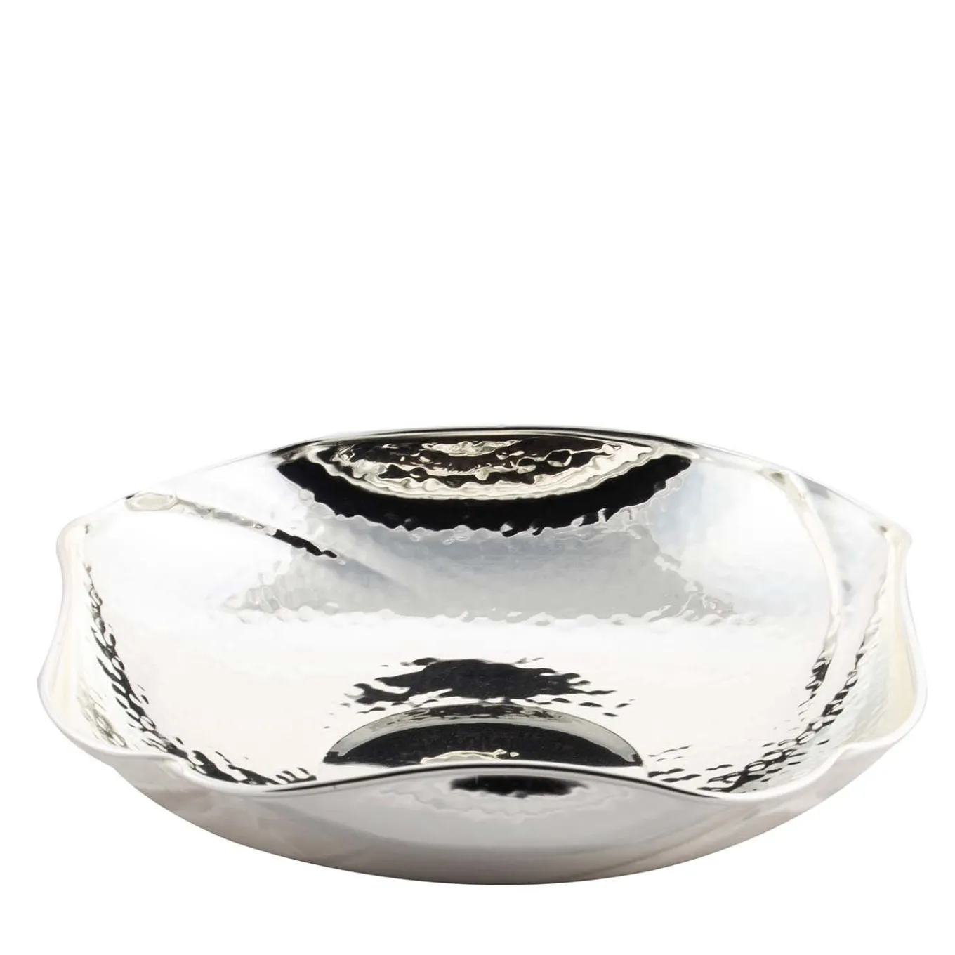 Elegant and timeless, this sophisticated centerpiece can be used on any occasion and to add a shimmering focal point to any room. Arranged in multiples to serve cocktail accompaniments in the dining room, or as jewelry holder for large stone necklaces or cuff bracelets on a bedroom dresser, this elegant silver-plated piece is forged with a square shape and gently folded sides with a scalloped rim that evoke the petals of a flower. The hand-hammered finish adds a vintage allure to this charming piece that will find the perfect place in any home.