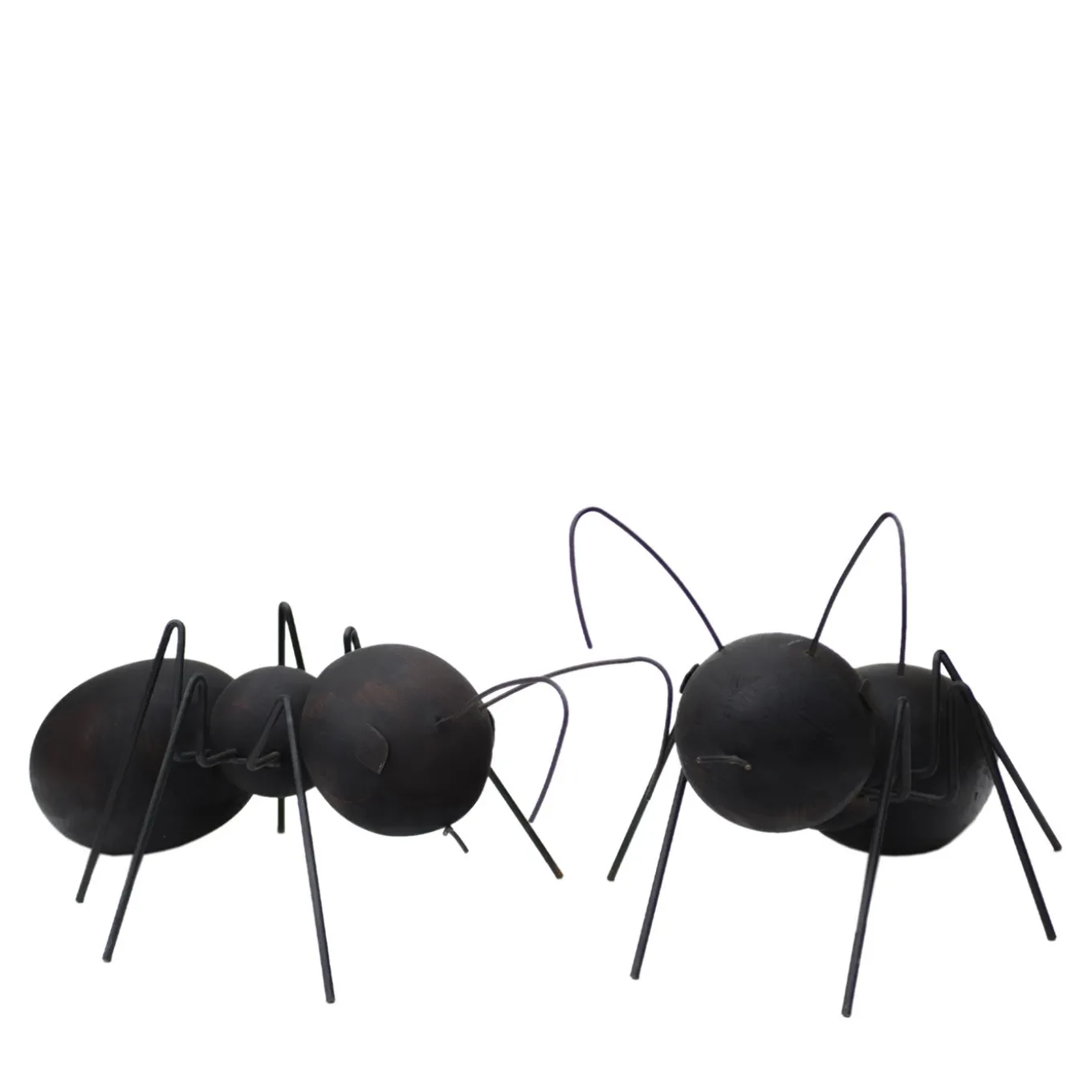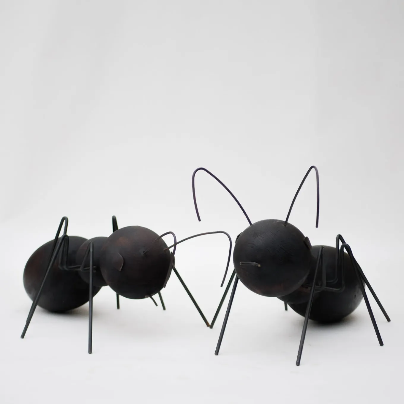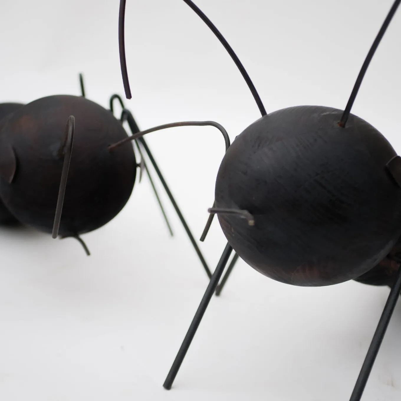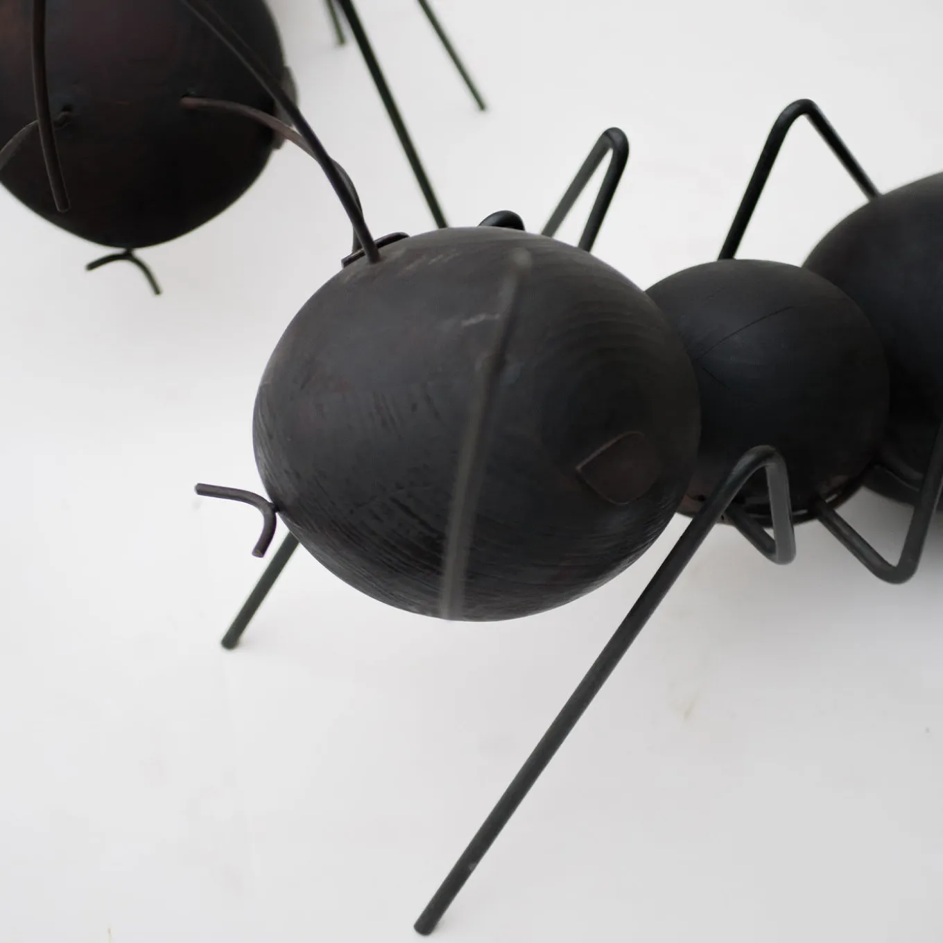 This playful set comprised of two ant-shaped sculptures – “formica” is the Italian for ant – is an ode to the underrated value and natural altruism of these little animals, here represented with unrivaled mastery. Both the larger (cm 75x45x41 H) and the smaller ant (cm 62x42x27 H) features bodies consisting of wooden spheres with a fire-burnt surface and of antennae, mouths, eyes, and legs handcrafted from burnished iron that is bent with fire and then protected with oil.