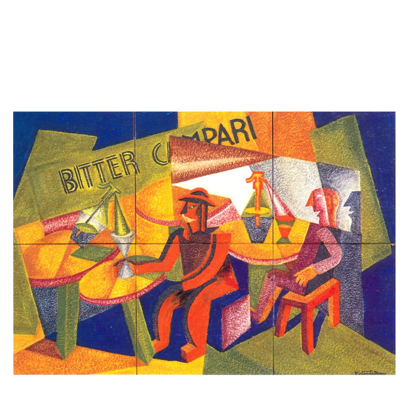 This decorative panel features a reinterpretation of a Fortunato Depero design originally created for Campari. Rooted in the 1930s Futurist movement, it echoes the collaborative ceramic works produced by prominent artists of the era in Albisola, Italy. The panel replicates the original composition through a set of ceramic tiles, maintaining historical techniques and materials. It reflects the avant-garde spirit and cultural heritage of early 20th-century Italian art.