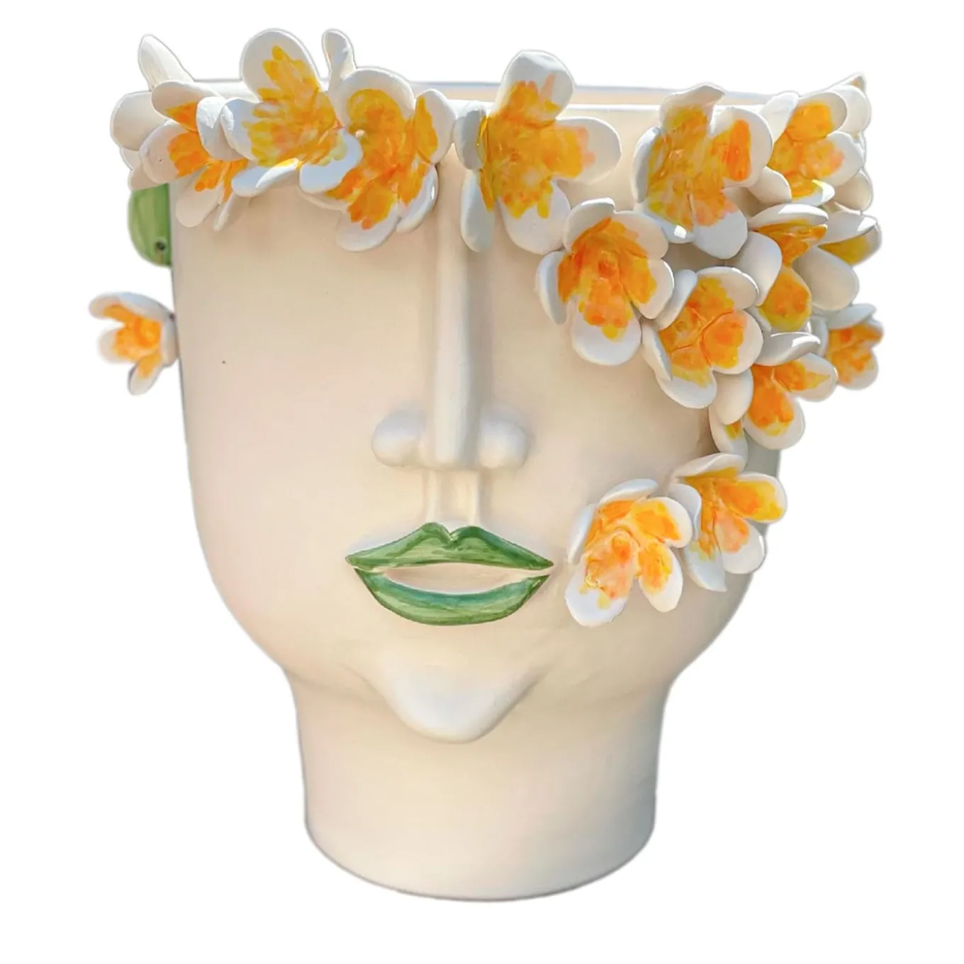 Extraordinarily crafted and decorated by hand according to the ancient Sicilian traditions of Moor’s heads manufacturing, this gorgeous ceramic sculpture can be used as a flowerpot as well as a decorative objet d’art in both indoor and outdoor decors. Enriched with elegant applications of Plumeria flower, it is enameled with a cream white tone and green and orange details.