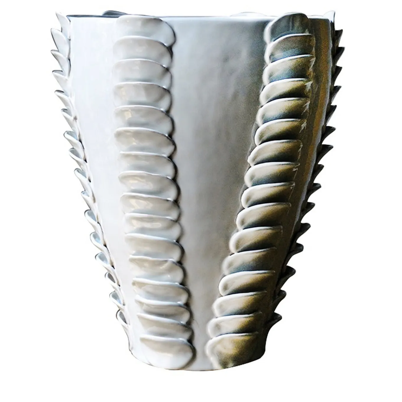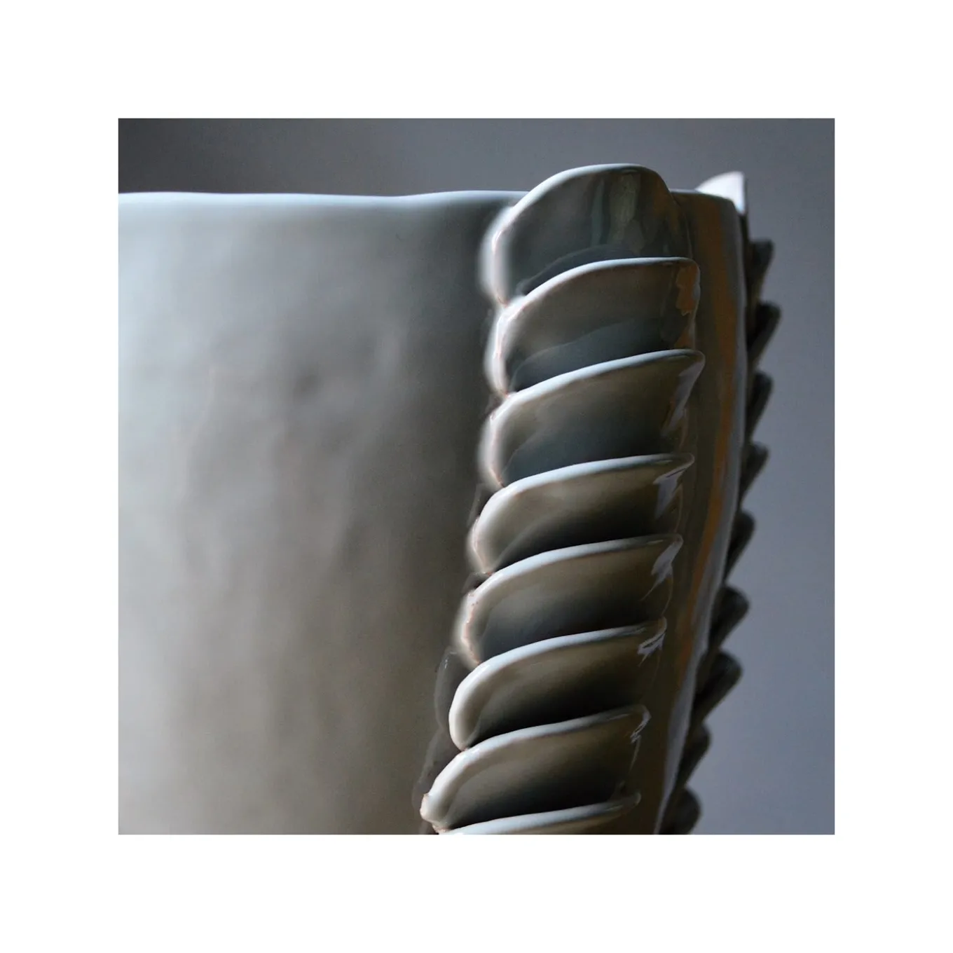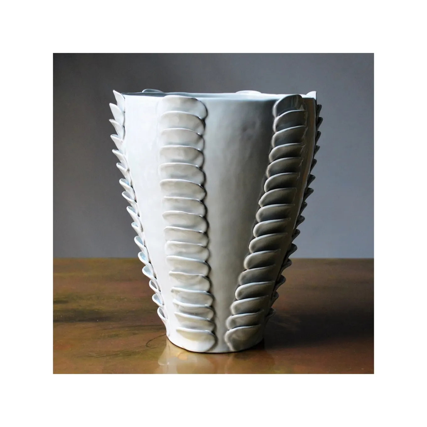 Masterfully glazed and completely handmade using the colombino technique, this sophisticated terracotta vase is part of the Frida collection. It features a simple shape with an ample opening and a soft pale blue glossy finish. The exquisite decoration of overlapping disks running along the side adds a timeless appeal to this highly decorative piece that will make a statement in any decor.