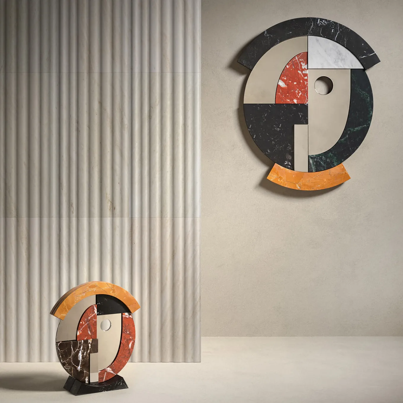 A hybrid between a vaguely anthropomorphic sculpture and a piece of functional decor, this table mirror is sure to infuse bedroom or bathroom decors with eccentric artistic allure. Mirrored glass pieces are combined with an array of different prized marbles, in a stimulating selection of unique veins and color tones. The use of natural stone and the impeccable craftsmanship make this piece an authentic objet d’art.