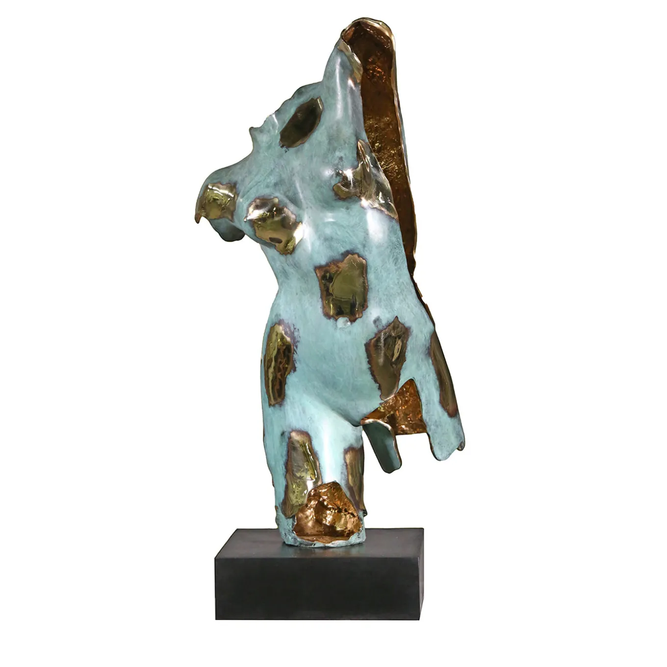 This decorative sculpture features a dynamic form created through the lost-wax casting technique, showcasing a distinctive patina in green with fire-treated brushwork details. Mounted on a bronze base, this sculpture offers a striking interplay of textured surfaces and polished bronze highlights. Designed to serve as a captivating decorative element, it embodies a blend of classical inspiration and contemporary artistry.