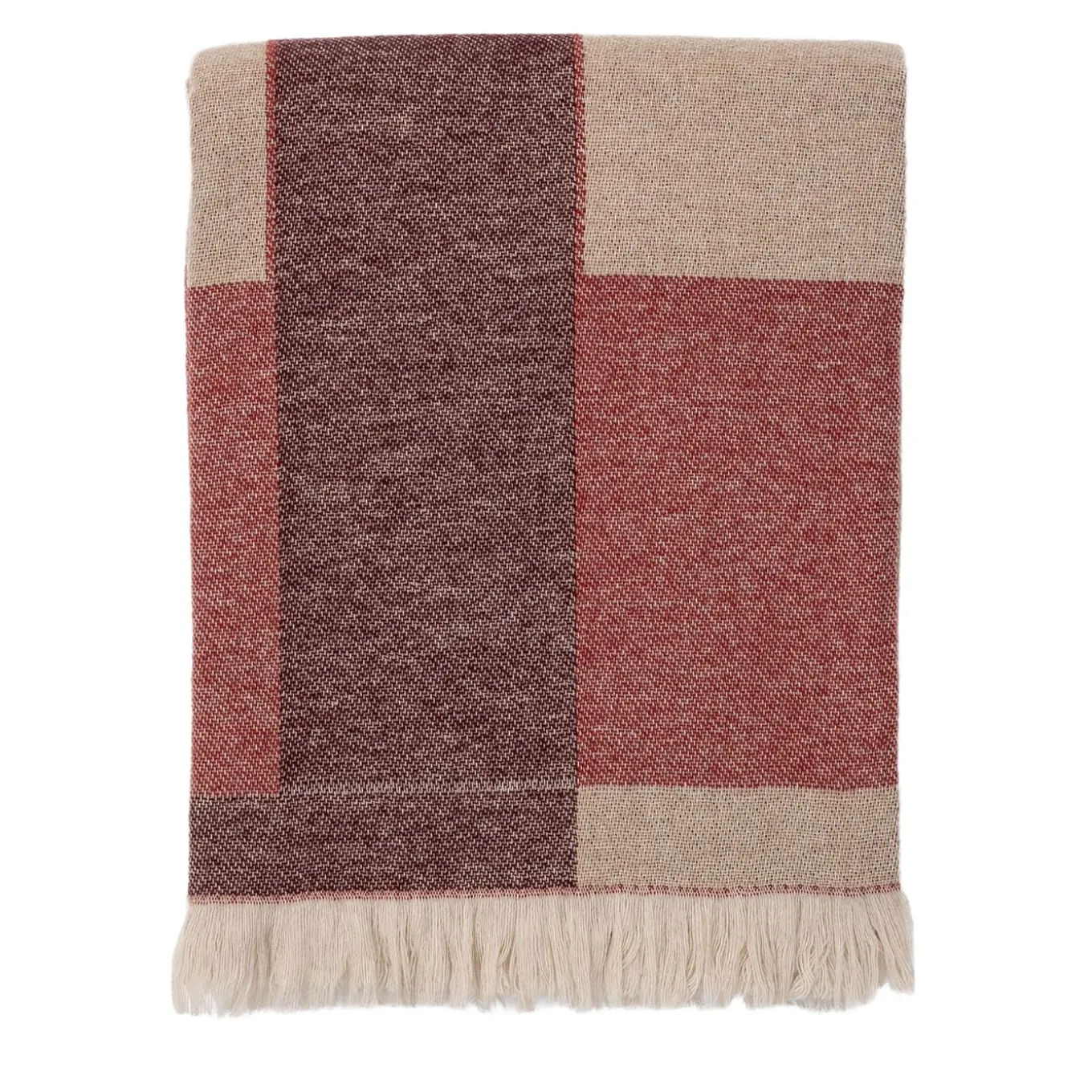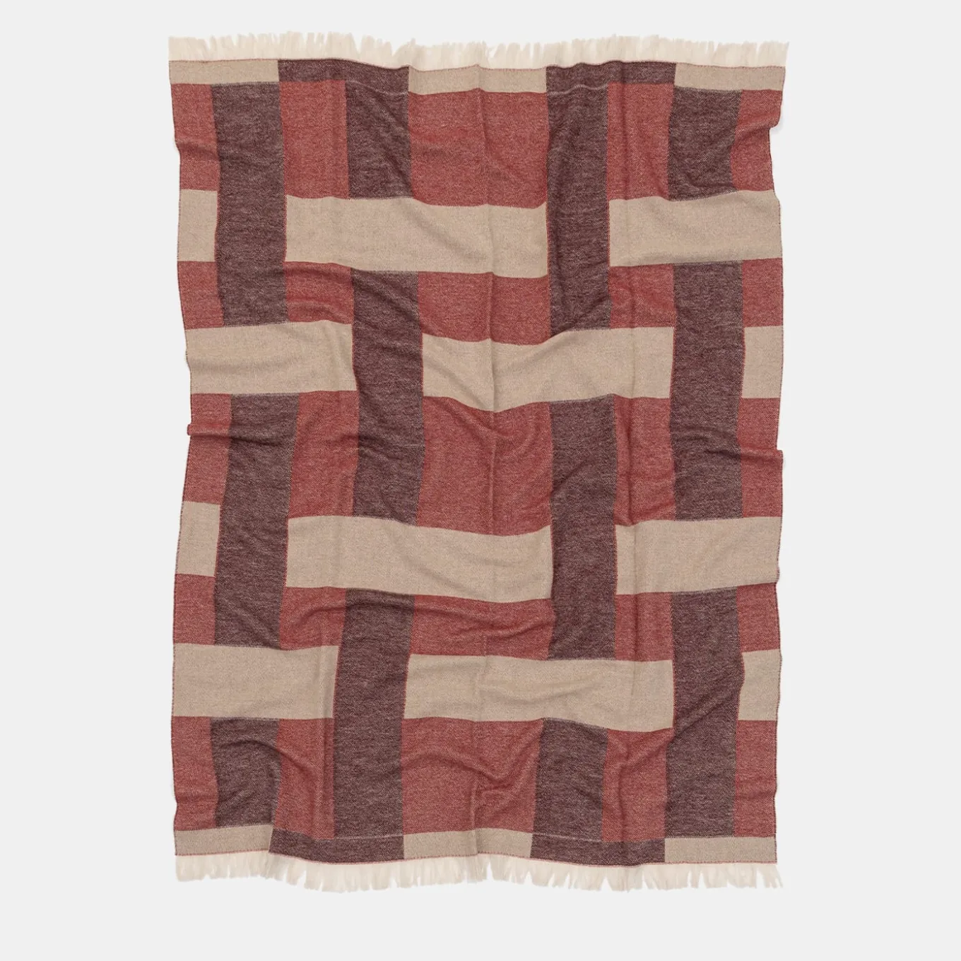 Bold red-toned bands intersecting in a dynamic intertwined pattern describe the sophisticated design of this blanket. The exceptional warmth it guarantees thanks to its blend of 80% wool and 20% cashmere yarns also extends to a chromatic vision that takes its rusty red hues into account. Extra-thin beige fringes along the entire edge seal the design.