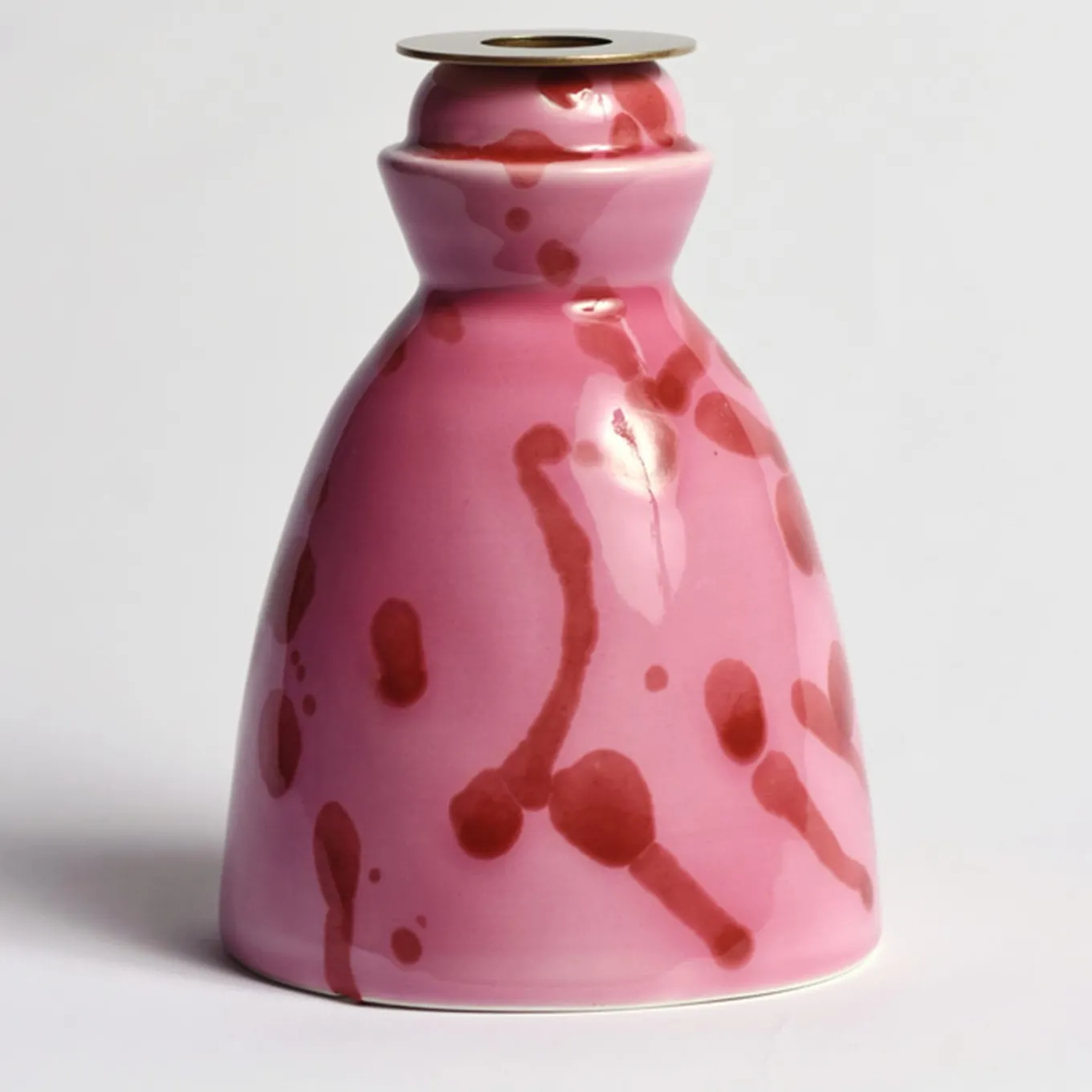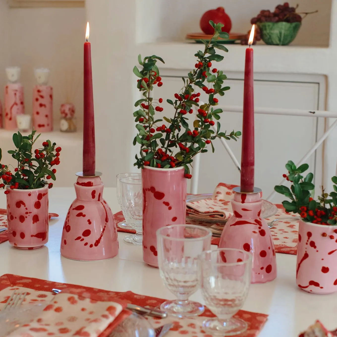 Decorative hand made ceramic candlestick with satin brass wax collector and 4 scented candles set Melograno. Immerse yourself in the magic of a candlelit dinner with the delicate Pomegranate fragrance. The candlestick comes in a gift box that includes the set of 4 scented candles, made of recycled cardboard from certified sources