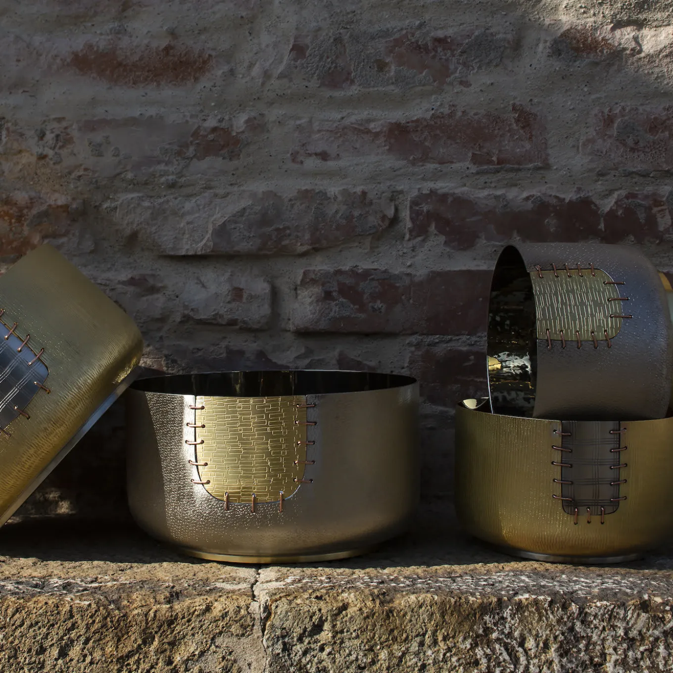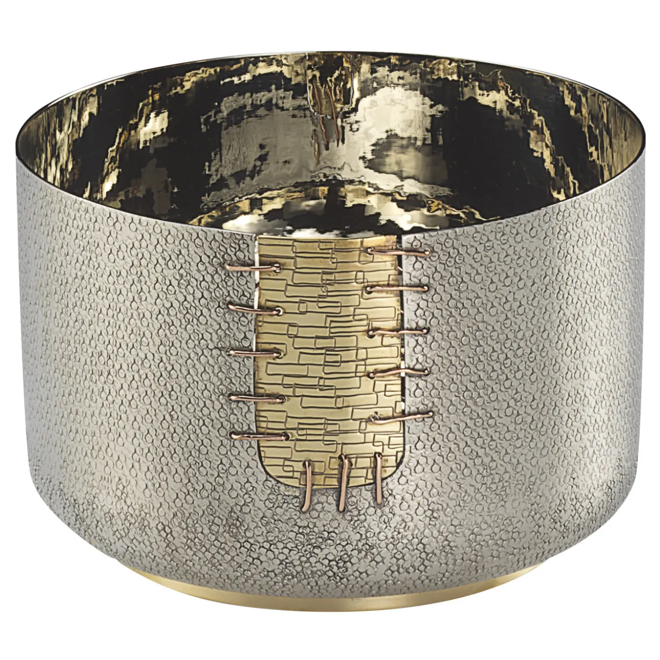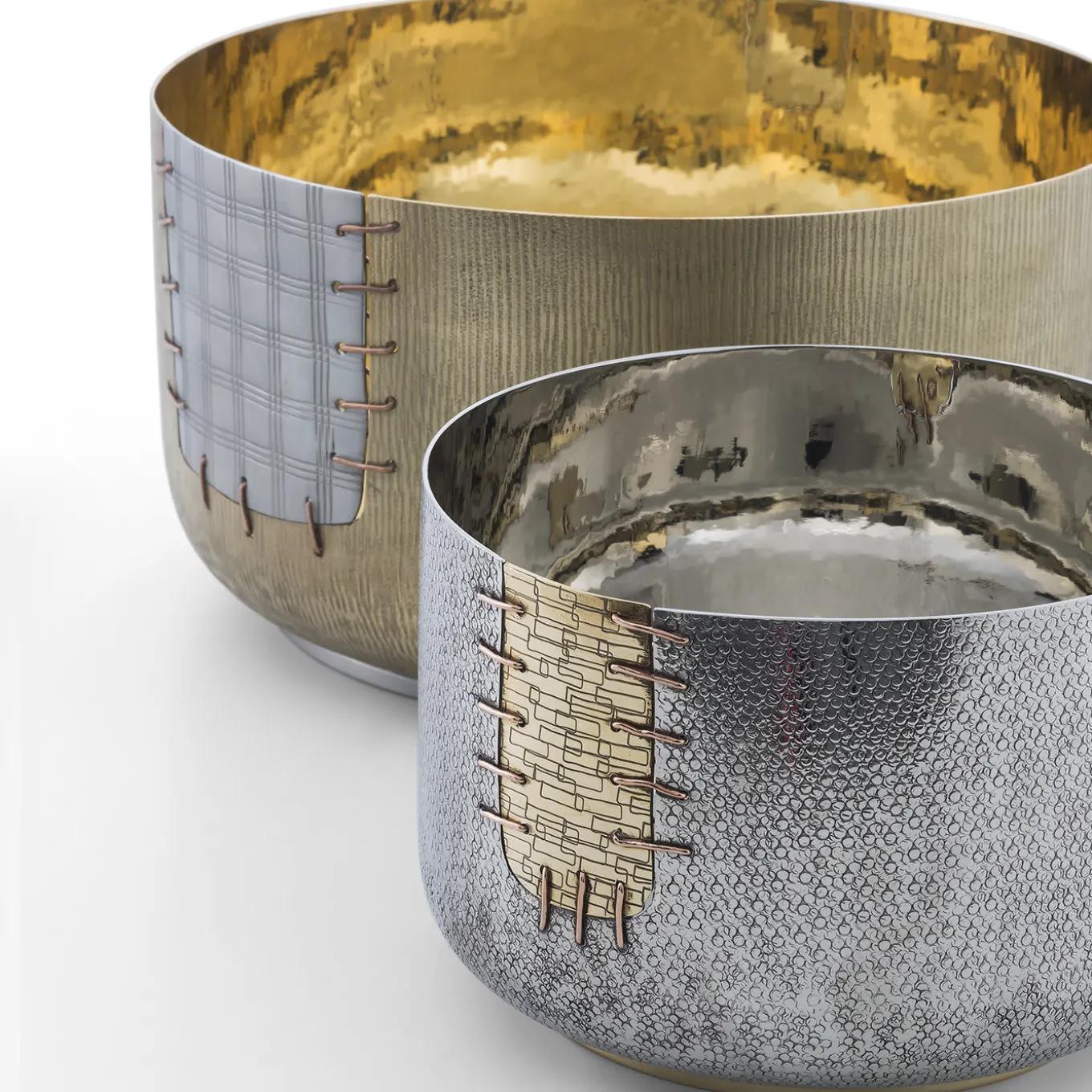 This bowl is a versatile and striking addition to any modern home where, both as a vase or a centerpiece, it will make a statement. Its simple silhouette is adorned with a decorative patch that seems to have been sewn on it. Part of a limited series, the copper, white bronze, and brass used reflect the surrounding light in a unique way, while the patch symbolizes the quest to repair and not throw away broken objects, according to the Japanese philosophy of Kintsugi.
