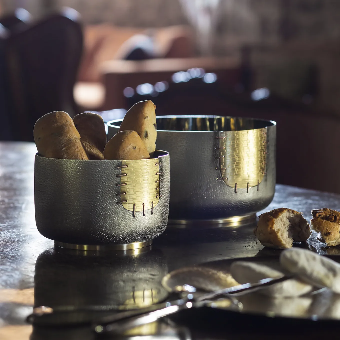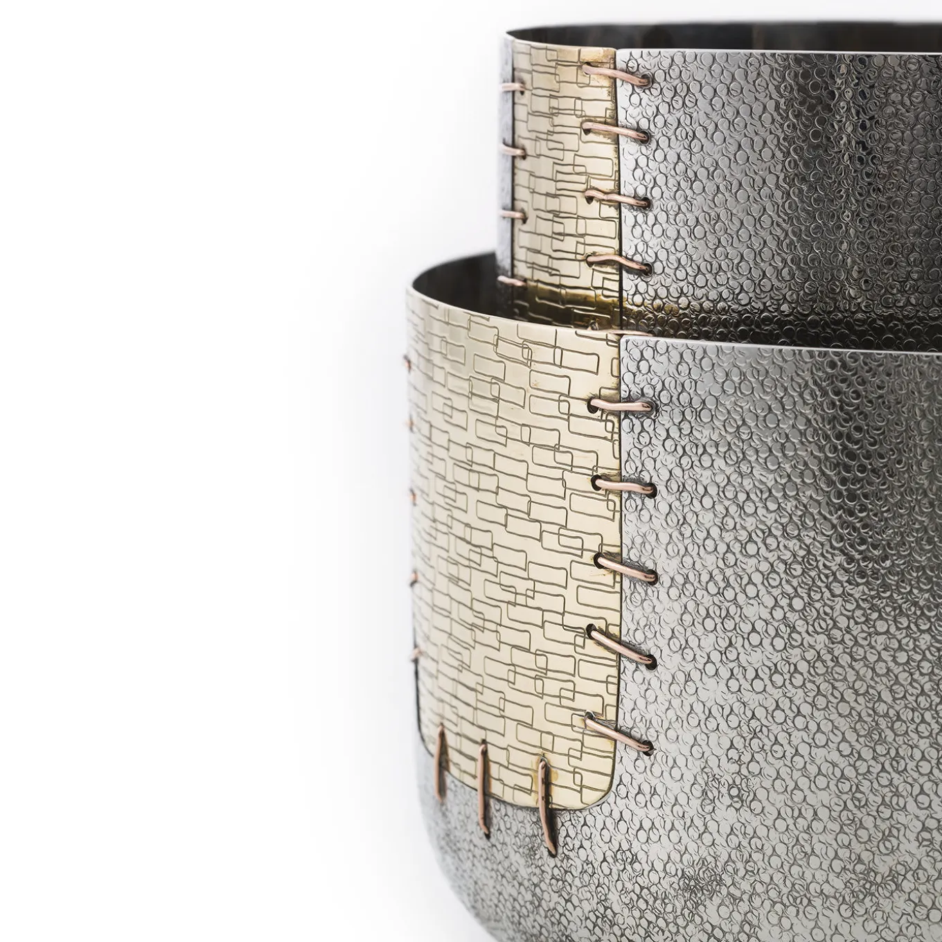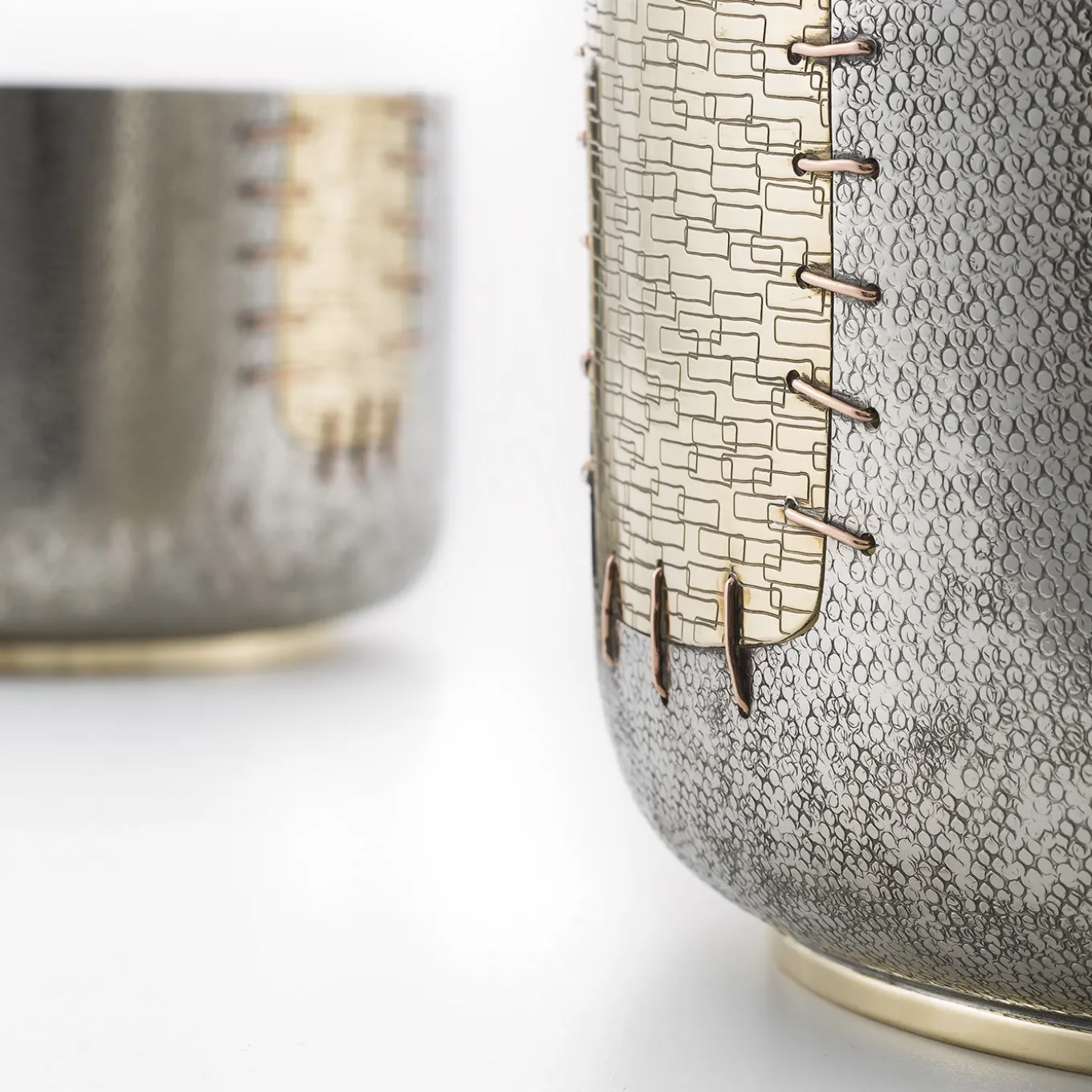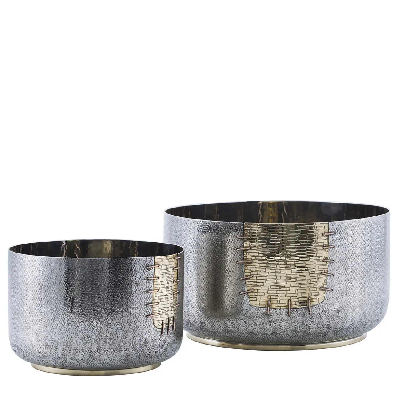 This bowl is a versatile and striking addition to any modern home where, both as a vase or a centerpiece, it will make a statement. Its simple silhouette is adorned with a decorative patch that seems to have been sewn on it. Part of a limited series, the copper, white bronze, and brass used reflect the surrounding light in a unique way, while the patch symbolizes the quest to repair and not throw away broken objects, according to the Japanese philosophy of Kintsugi.