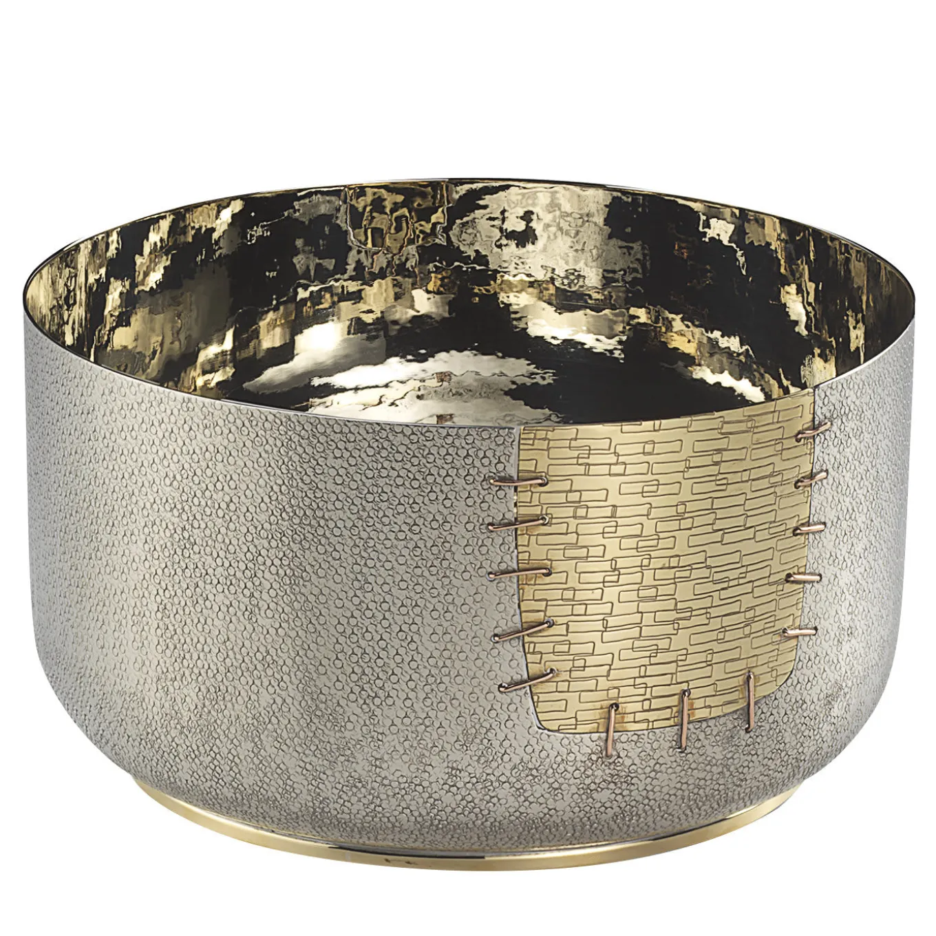 Inspired by Kintsugi – a Japanese philosophy that considers any cut and damage to an objects an enriching element that makes it unique and precious – this large bowl is made of brass, white bronze, and copper and boasts a patch that seems to have been sewn in to repair the piece. Its simple silhouette and generous size give the piece a versatile quality that allows it to be a vase, a centerpiece, or a decorative sculpture to display anywhere at home.