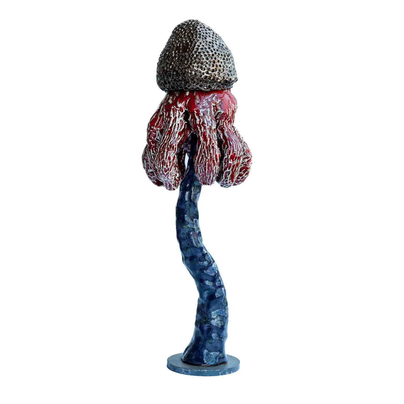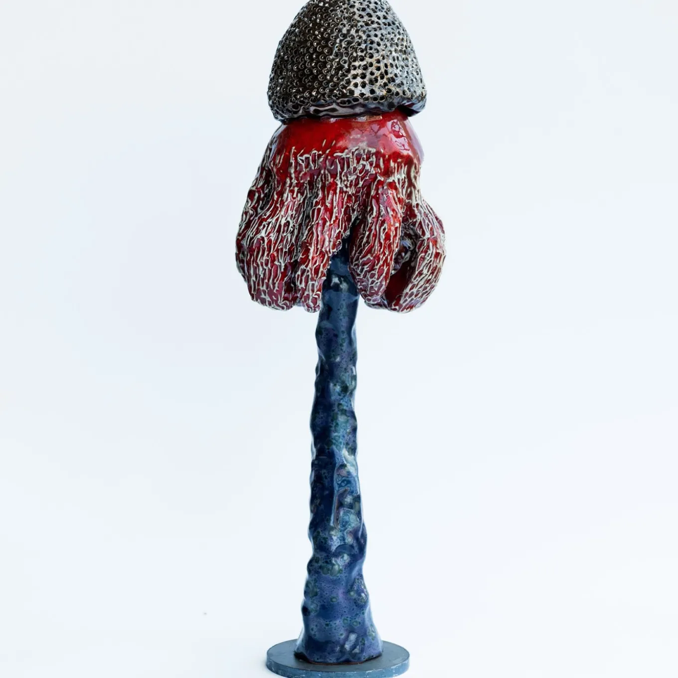 These ceramic sculptures are crafted from individually fired elements, each considered independently before being perfectly matched. The pieces are stacked on an iron base for ideal balance. Entirely hand-built and decorated, each piece is truly unique. Inspired by “fungi,” they evoke childhood memories and celebrate nature’s imperfections—crooked stems, bubbled surfaces, and scratches—transforming flaws into beauty. Since 2018, over 100 unique designs have been created, each one distinct.