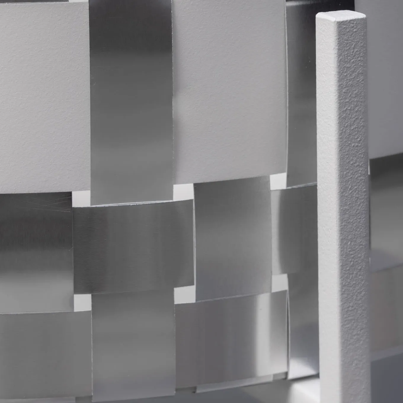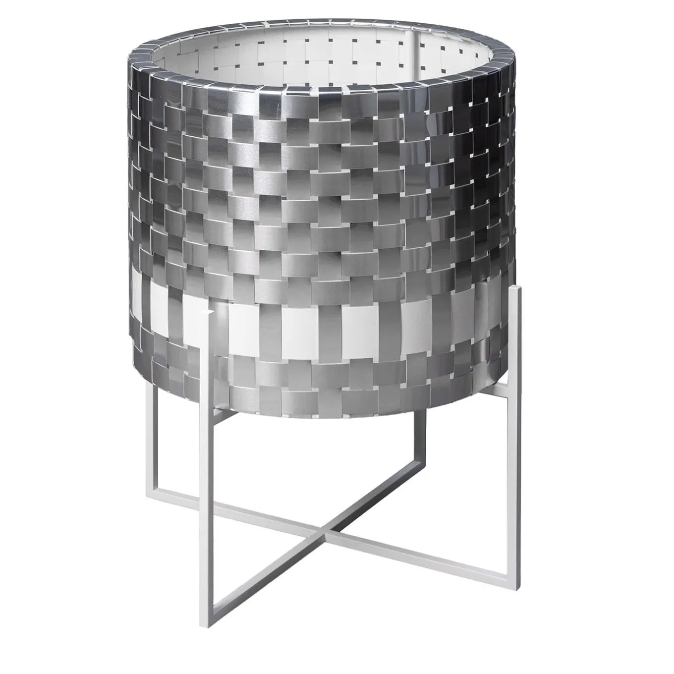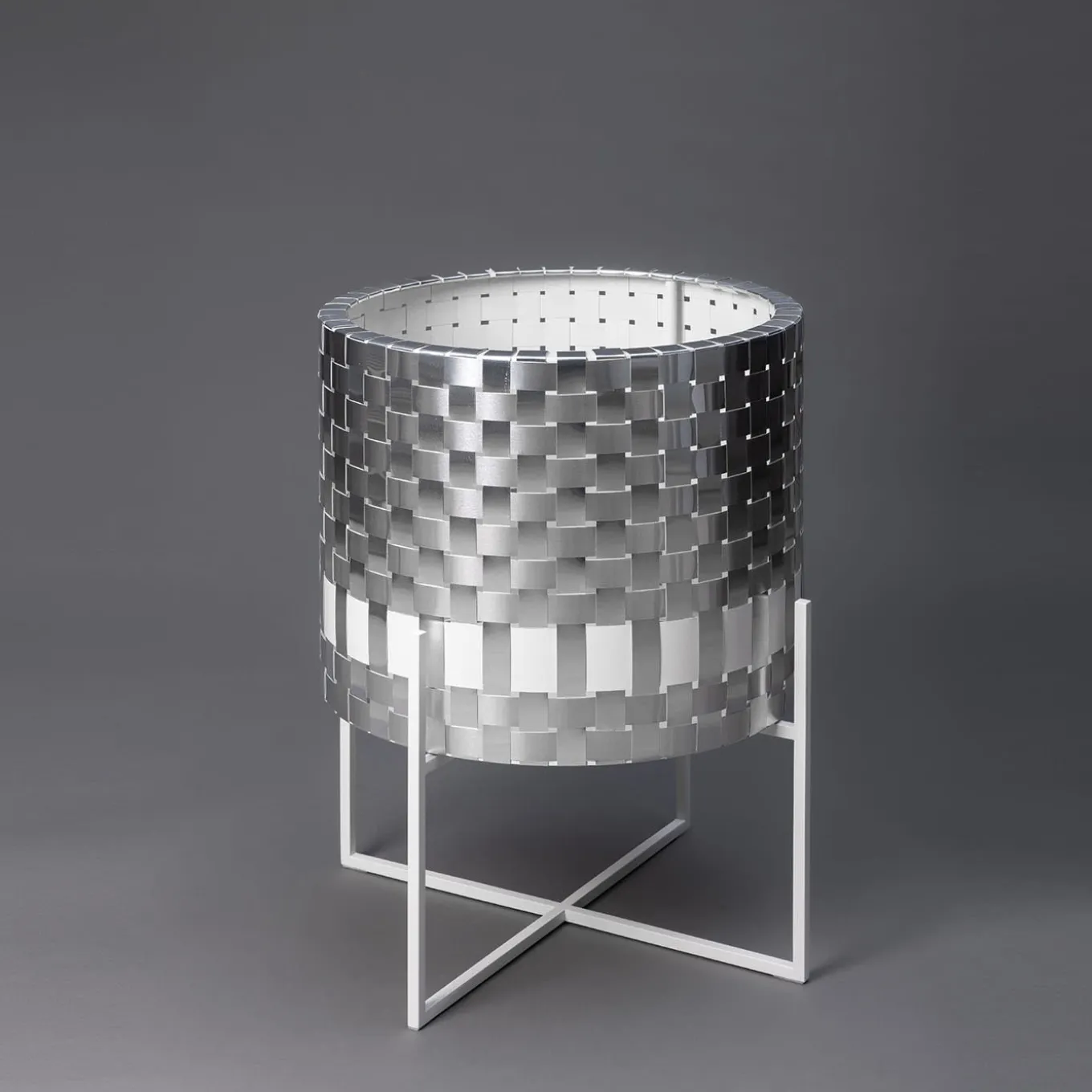 Inspired by the effortless refinement of a black Chanel sheath, this metal cachepot flaunts a sculptural silhouette that immediately captures the eye with its bright SPLOT® weft. A larger white band is the only contrasting element integrated in the weft, a detail evocative of an elegant belt accenting a woman’s waist. Sustained by a sleek base of intersecting feet, the cachepot finds ideal positioning in industrial-style contemporary interiors.