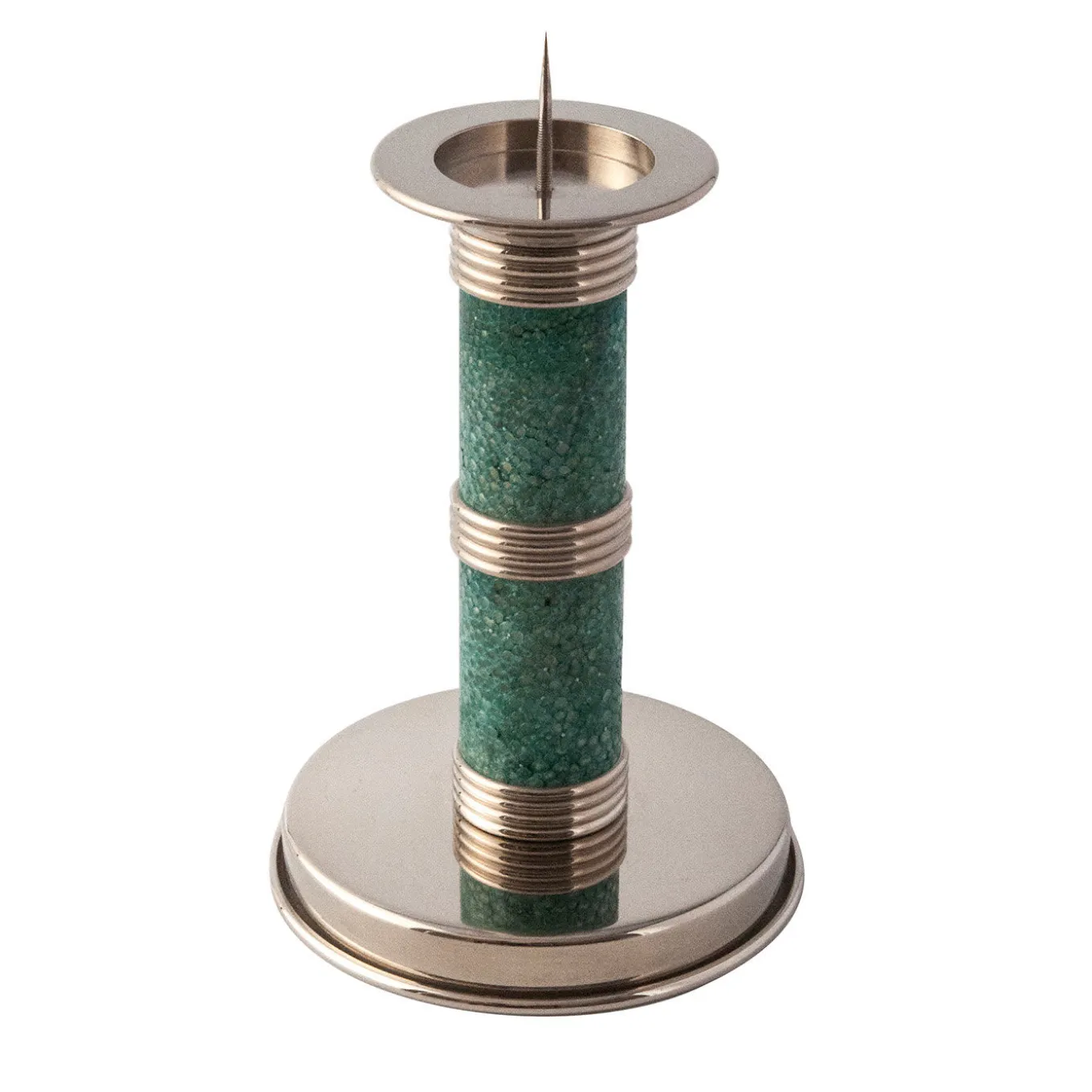 Sophisticated and functional, this dazzling candlestick is a must-have for a modern home. Designed and crafted by hand by Nino Basso for the Galucharme Collection, it features a polished nickel-plated brass structure with a round base (Ø 11cm) and drip catcher (Ø 6.5cm). The cylindrical stem is embellished with three grooved rings and wrapped in genuine shagreen in a modern emerald green hue. Care instruction booklet included in the ready-to-be-gifted custom box.