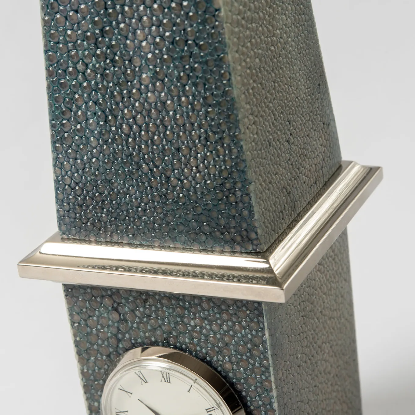 Inspired by Ancient Egyptian architecture, this obelisk-shaped watch will make a singular and refined addition to any decor. Part of the Galucharme Collection by Nino Basso, it is fashioned of polished nickeled brass, almost entirely upholstered in shiny gray Shagreen leather, particularly used in the 20s and 30s to enrich refined objects and furniture. Practical and elegant, it comes in an elegant black box (12x29xh.6 cm).