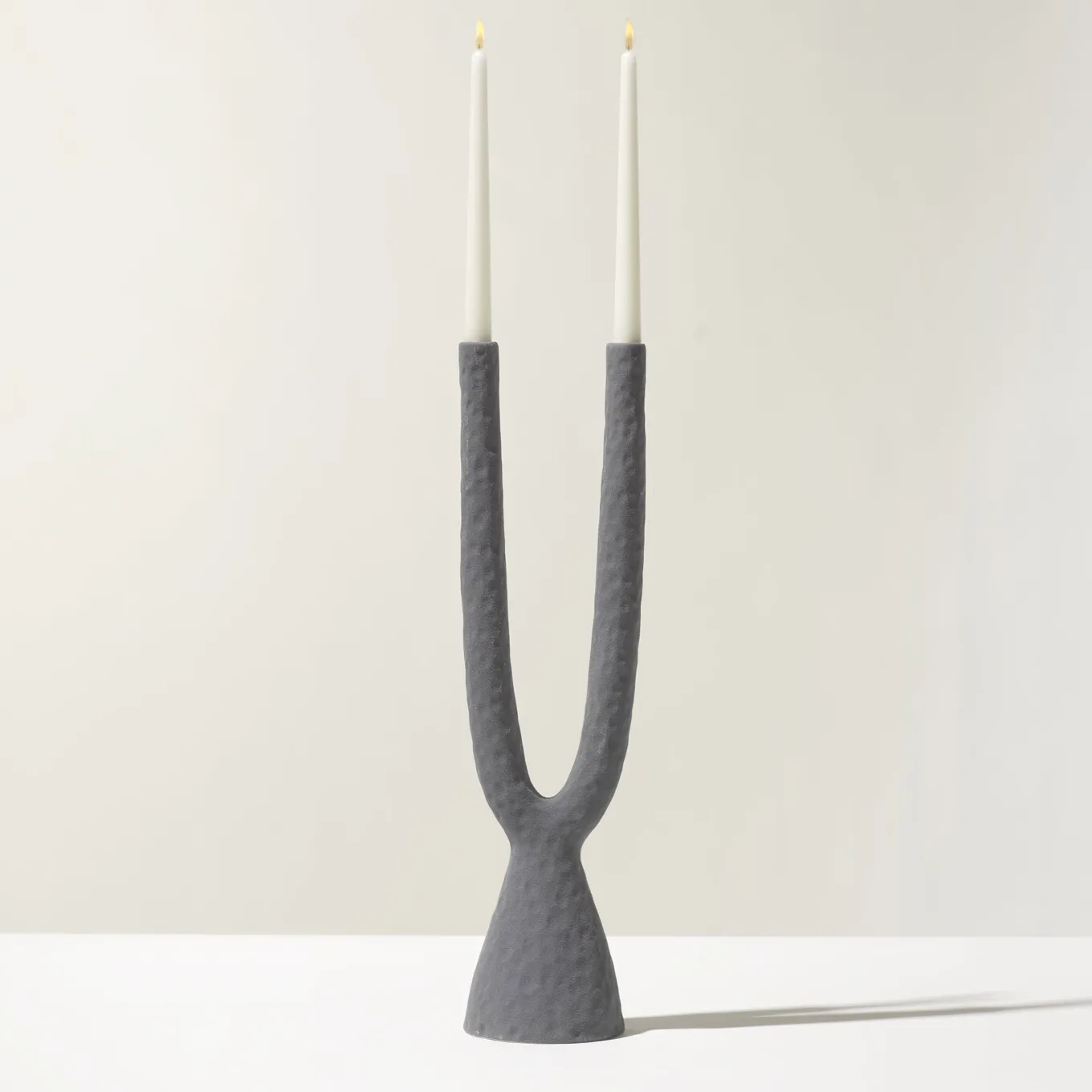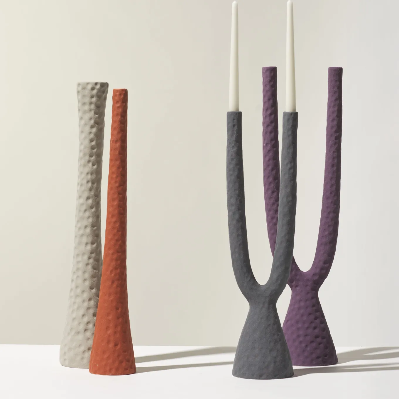 Candlestick inspired by a 1950s archive collection, featuring soft, organic forms reminiscent of Morandi’s still life compositions. The matte, textured glaze enhances the terracotta’s natural surface, evoking the feel of aged copper containers. Created using a clay mold and finished with airbrushed slip for a powdery, tactile appearance. The sculptural dual-arm design invites use alongside other pieces in the series for curated arrangements.