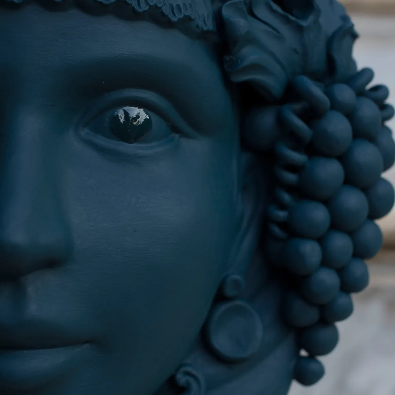 This anthropomorphic vase is made entirely by hand and painted in a dark blue opaque monochrome tint rich in natural pigments and resin binders that provide intense color depth. Only the eyes are glazed so they stand out, emphasizing the beauty of the gaze. The piece is inspired by ancient Sicilian legends of love and revenge between a Moor and a Maiden. The vase cannot be filled with water.