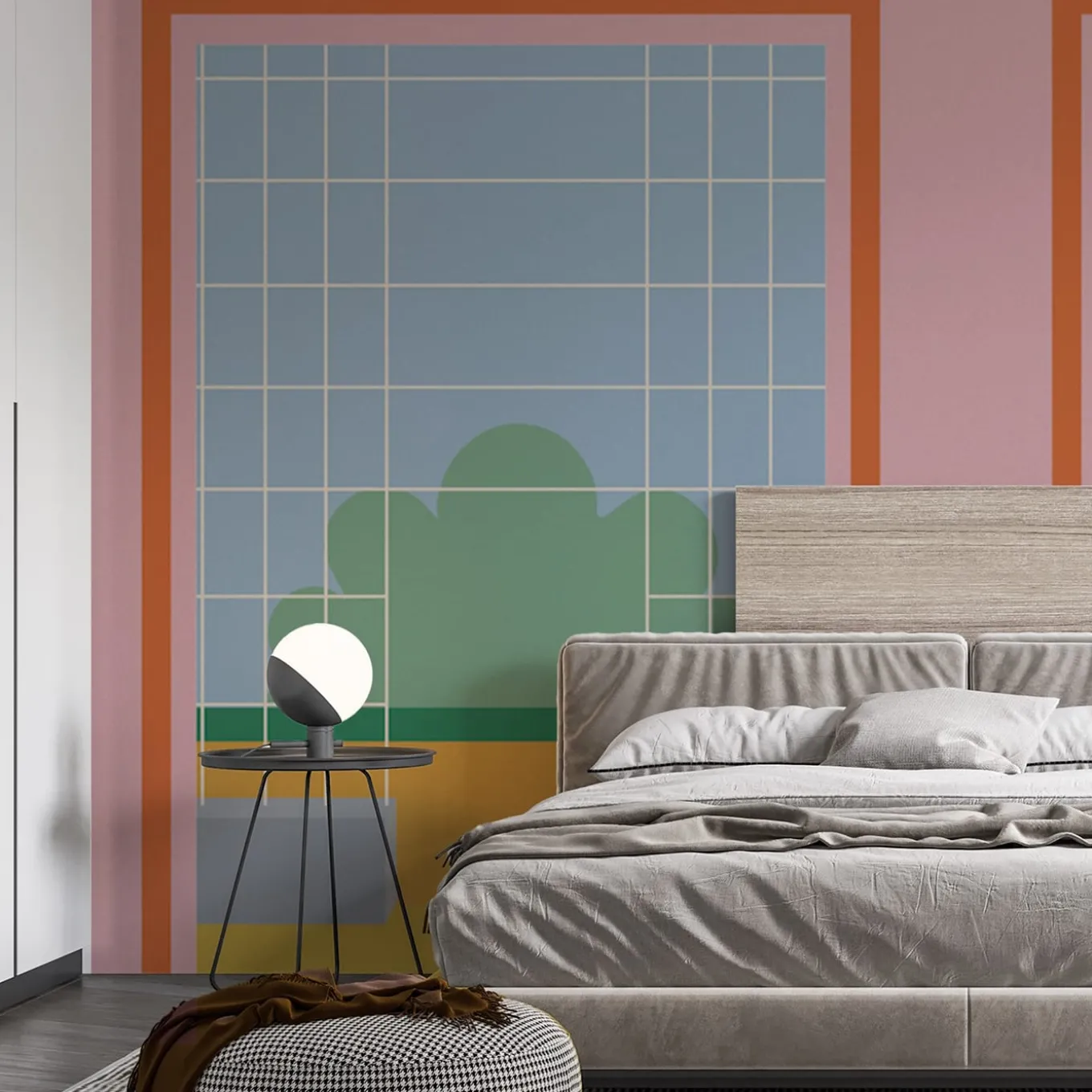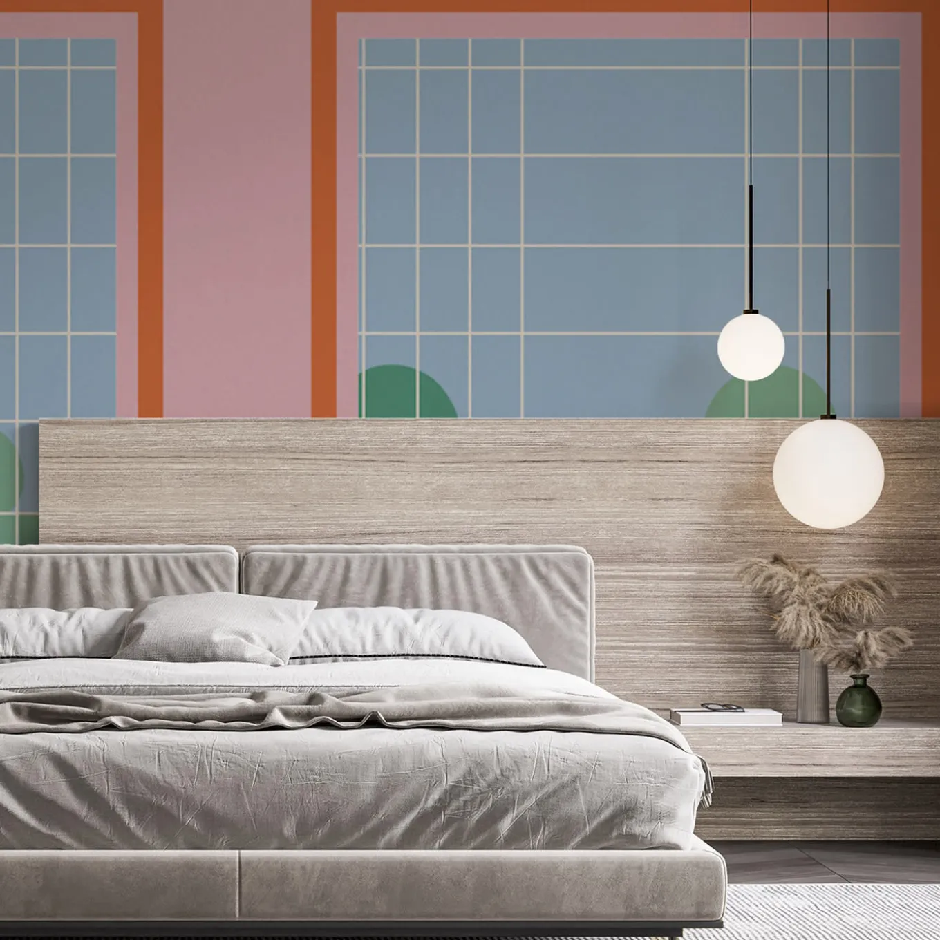 A spectacular way of adorning a private living room or contract waiting area, this gorgeous wallpaper features two open windows overlooking a green garden, rendered in clean and architectural lines that pay tribute to the Bauhaus School of Art and Design. Enhanced with an appealing pale red and yellow palette, it is made of cellulose, textile fibers, and vinyl. Fireproof, breathable, unscented, and hypoallergenic, it is also available in the ECO or fiberglass versions. The price is per squared meter.