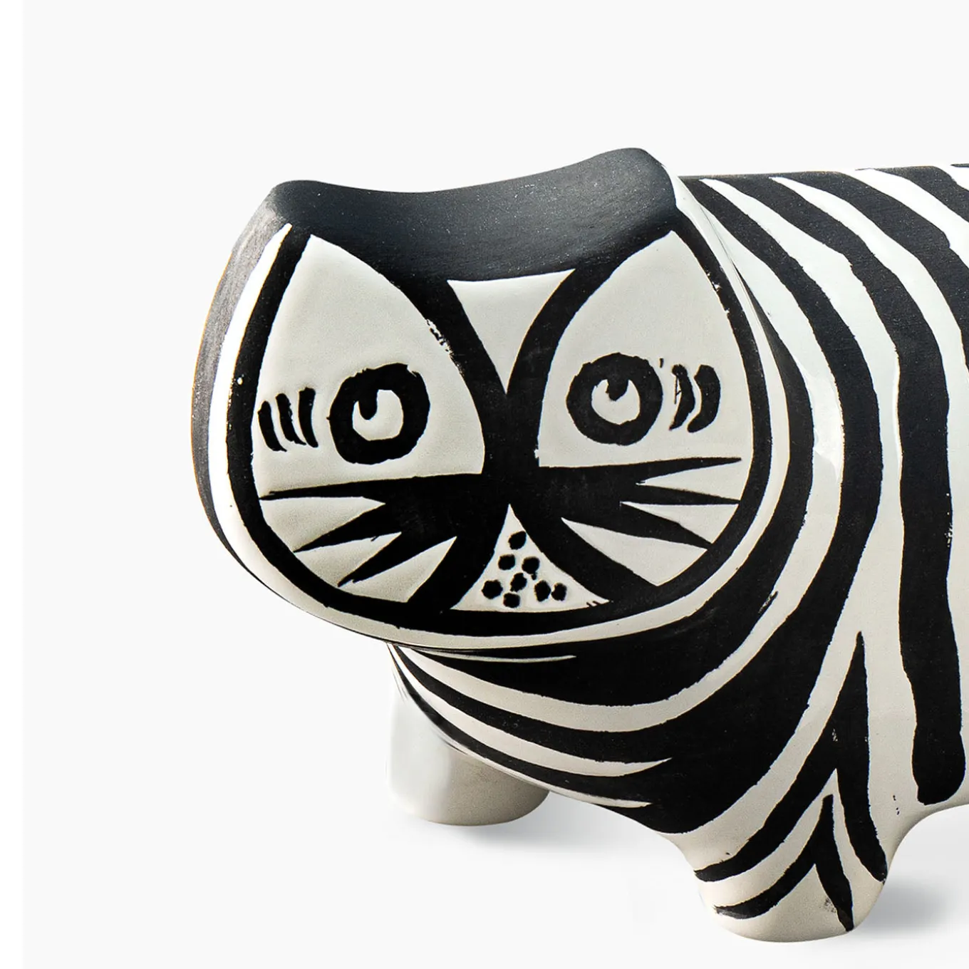 This striking sculpture in the shape of a tiger-skin cat (“gatto tigrato” in Italian) is crafted of top-rate ceramic painted using white and black enamels. Rendered in whimsical and impressive details, this original decorative piece belongs to the Riedizioni Archivio Storico Collection, which includes Bitossi’s cult designs.