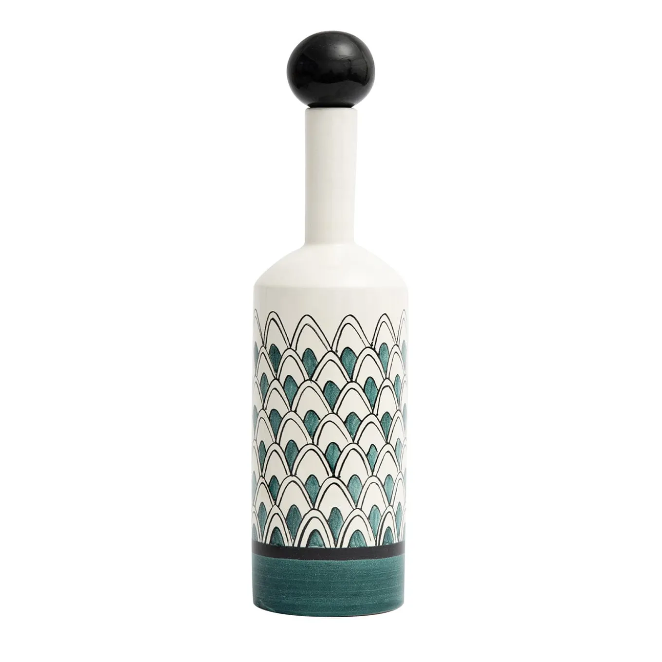 This refined ceramic bottle is a singular piece masterfully crafted and decorated by hand. A spherical black lid tops the narrow neck, whose lack of decoration is counterbalanced by the eye-catching motif reminiscent of peacocks’ plumage adorning the lower half of its body. Any slight imperfection is to be expected and appreciated as proof of its artisan quality.