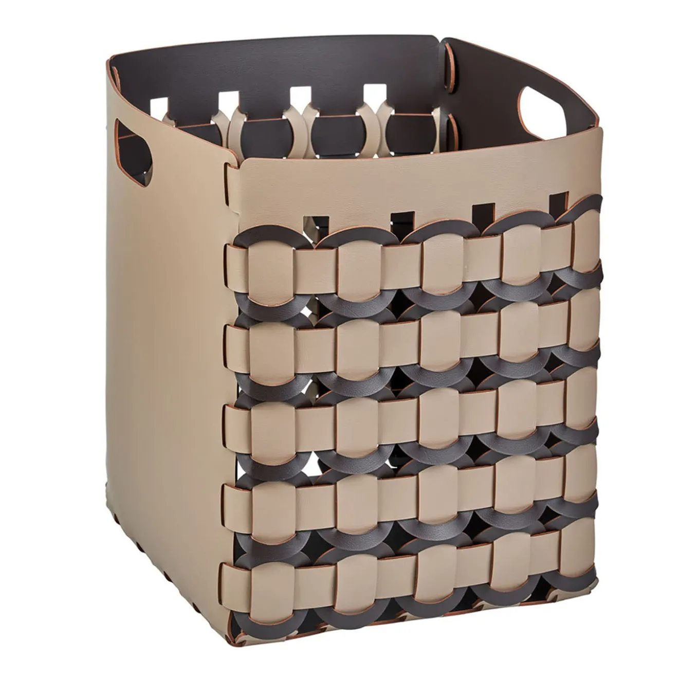 The geometric beauty of this basket creates a captivating visual display by combining octagons, squares, and circles in a stunning weave. Made with high-quality materials, this basket is designed to withstand the elements and stand the test of time. Its versatility makes it suitable for indoor and outdoor use, offering a practical and beautiful solution for any space. Available in Cappuccino/Chocolate. Designed by Ekaterina Borovkova.