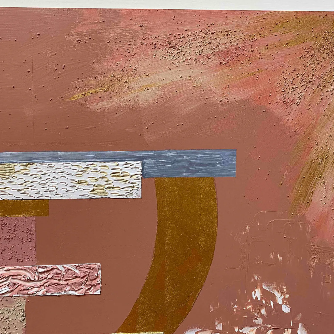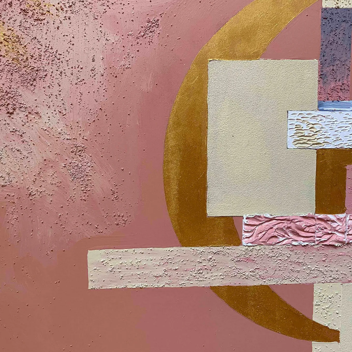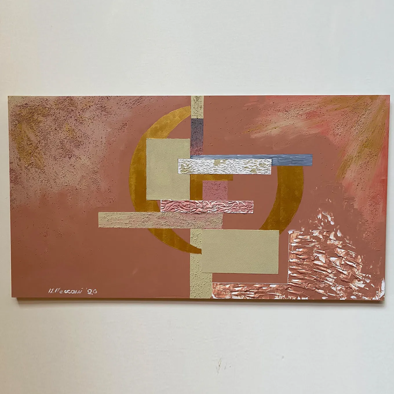 Designed by Tuscany-based artist Mascia Meccani as part of the Geometrie series, this wall panel is an eye-catching decoration for an open wall. The piece is entirely handpainted on wood using mixed techniques, with layers of concrete with a textured stucco-like finish and sand. The abstract geometric shapes in gray, gold, red, blue, and white, are positioned in the center of a predominately umber background. Variations from the pictured item are to be expected due to the exclusive handmade process.
