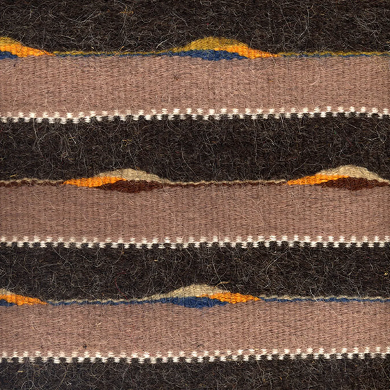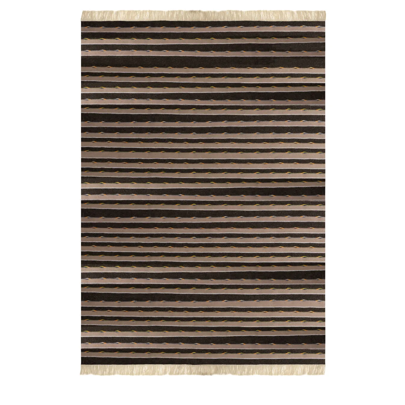 This modern and sophisticated rug is a contemporary interpretation of traditional Sardinian designs. Made entirely of Sardinian wool that was given an anti-moth treatment, this rug was crafted entirely by hand using ancient methods on a vertical loom. It is made to order and takes 30 days from purchase to be completed. Both sides can be displayed. This elegant design symbolizes the power of nature, with horizontal lines over the black background decorated with small elements hinting at a multitude of sprouts (hence the name of the piece in Italian).
