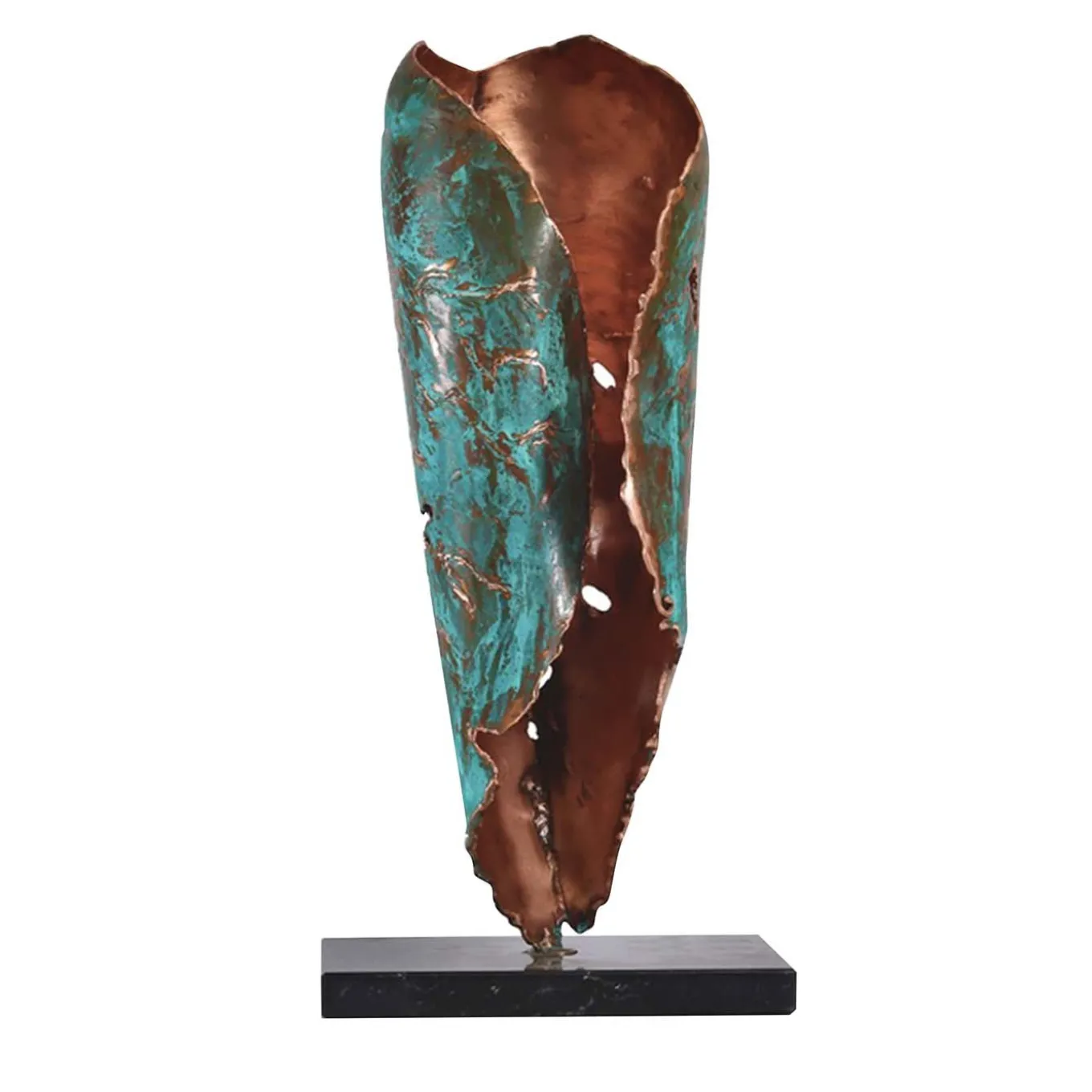 A new bud peeks out from under a pile of fallen leaves. The life cycle of nature continues on, in all its magnificent colors. This statue is made with recycled copper that is worked by hand and completed with natural treatments to bring out the green tone. A sustainable piece, made entirely by hand.