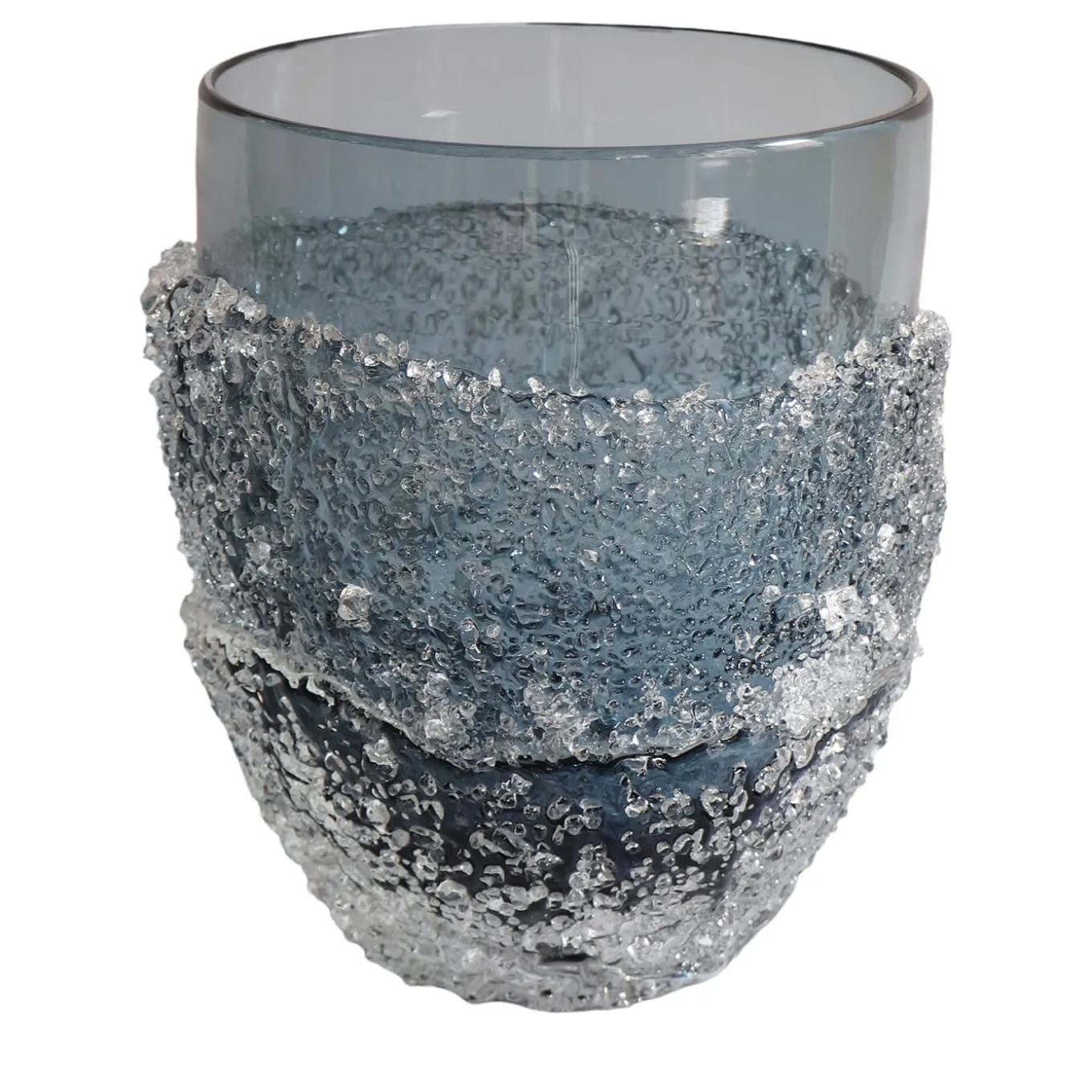 Ghiaccio – the Italian word for ice – is the effect produced by ‘Granzioli’, small glass fragments that resemble crushed ice. To create this special texture, a bed of Granzioli are applied on the main piece while it is still incandescent. The result is a thick and uneven layer of glass granules that envelops the surface of the vase. To highlight the contrast, a portion of the vase is left uncovered and smooth.