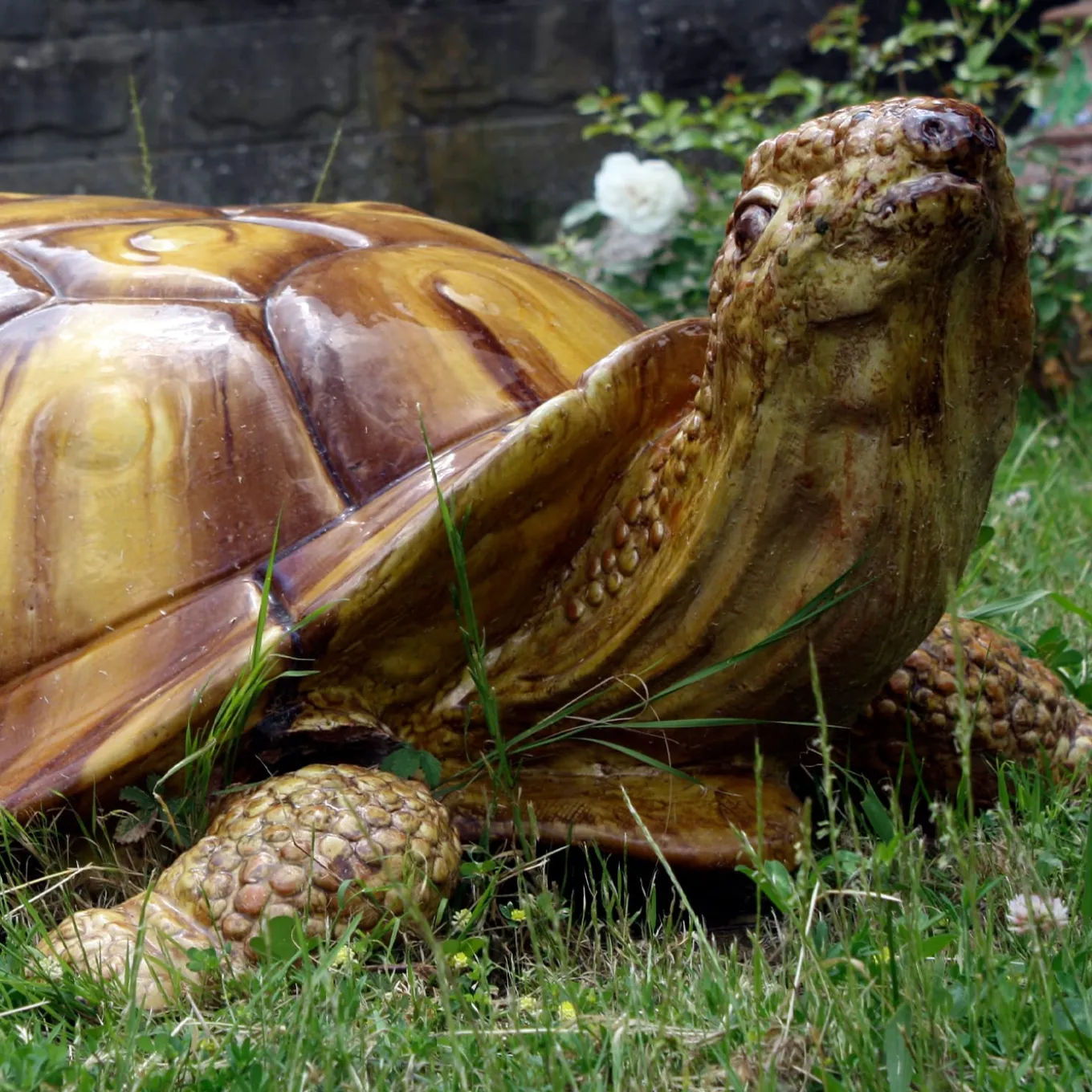 Playful in its shape as it is precious in its crafting process, this tortoise-shaped sculpture makes for a striking decorative addition to a private garden. Its body is handcrafted of fine ceramic and meticulously handpainted to render its traits with impeccable realism, an effect emphasized by a masterful distribution of hues and deft brushstrokes.
